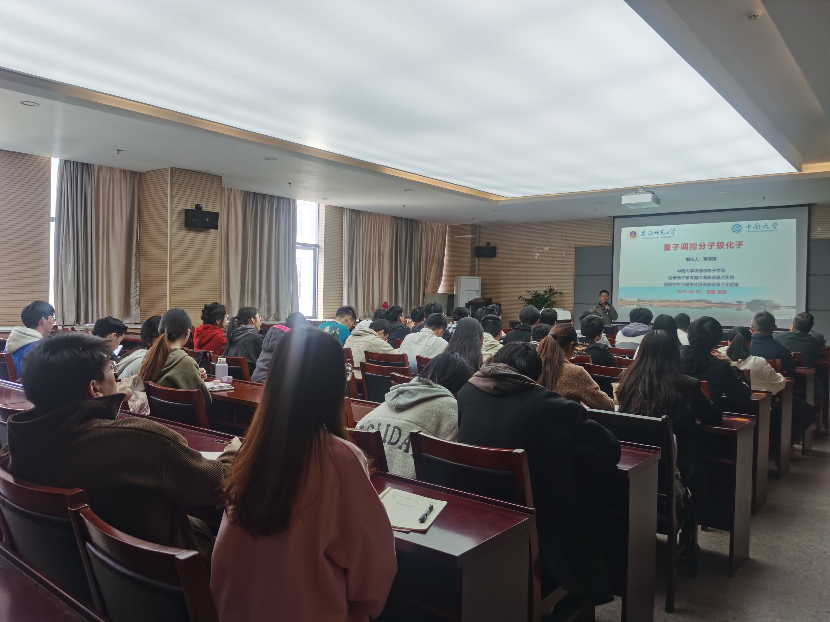 报告会上,束传存教授阐述了当光学腔场的电磁模与分子的电子、振动或者转动模式产生强耦合时,会形成一种具有光子和分子纠缠性质的分子极化子(Molecular Polariton),它有机融合了量子光学和化学物理两前沿交叉领域,并推动极化子化学(Polariton Chemistry)新领域的快速发展。同时,束教授介绍了中南大学超快量子调控研究组在量子调控分子极化子方面的研究进展,展示了如何实用新发展的量子调控理论设计复合太赫兹光场,用于精准调控单个转动分子与真空腔场强耦合形成的分子极化子。束教授在报告中同与会师生分享了课题组在超快物理、量子光学和控制理论等交叉方向的研究,相关研究成果已实现调控非线性光学效应在量子光学、量子信息、量子计算和量子生物学等领域具有十分重要的物理意义和基础前沿研究价值。报告会结束后,与会师生就相关问题同束传存教授展开了热烈讨论和交流。
