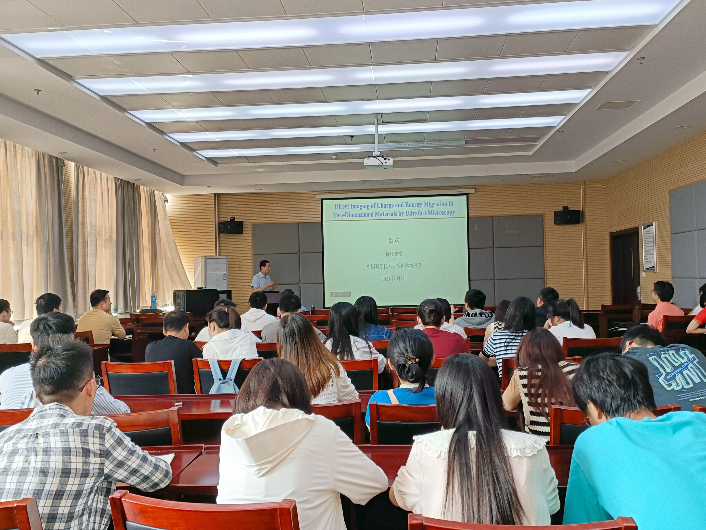 报告会上,袁龙教授首先简要介绍了二维材料的应用前景以及利用超快成像技术研究二维材料的相关进展。他指出二维层状材料因其在纳米尺度下具有独特的光学性质和电子结构,日益引起广泛的研究兴趣;研究二维材料及其异质结材料中的电荷和能量迁移过程对于深入理解其能量转化机理和发展新型低维光电器件具有重要意义。随后,袁龙教授同与会师生分享了利用超快显微成像研究二维材料载流子动力学机制的相关工作。通过超快显微成像所具有的高空间(200 nm)和时间分辨能力(200 fs),袁龙教授所在课题组系统研究了二硫化钨/石墨烯和二硫化钨/二硒化钨异质结的界面电荷转移、载流子生成机理和层间激子输运等光物理过程,为厘清二维材料的光与物质相互作用机制提供了重要参考。报告会结束后,与会师生就相关问题同袁龙教授展开了热烈讨论和交流。