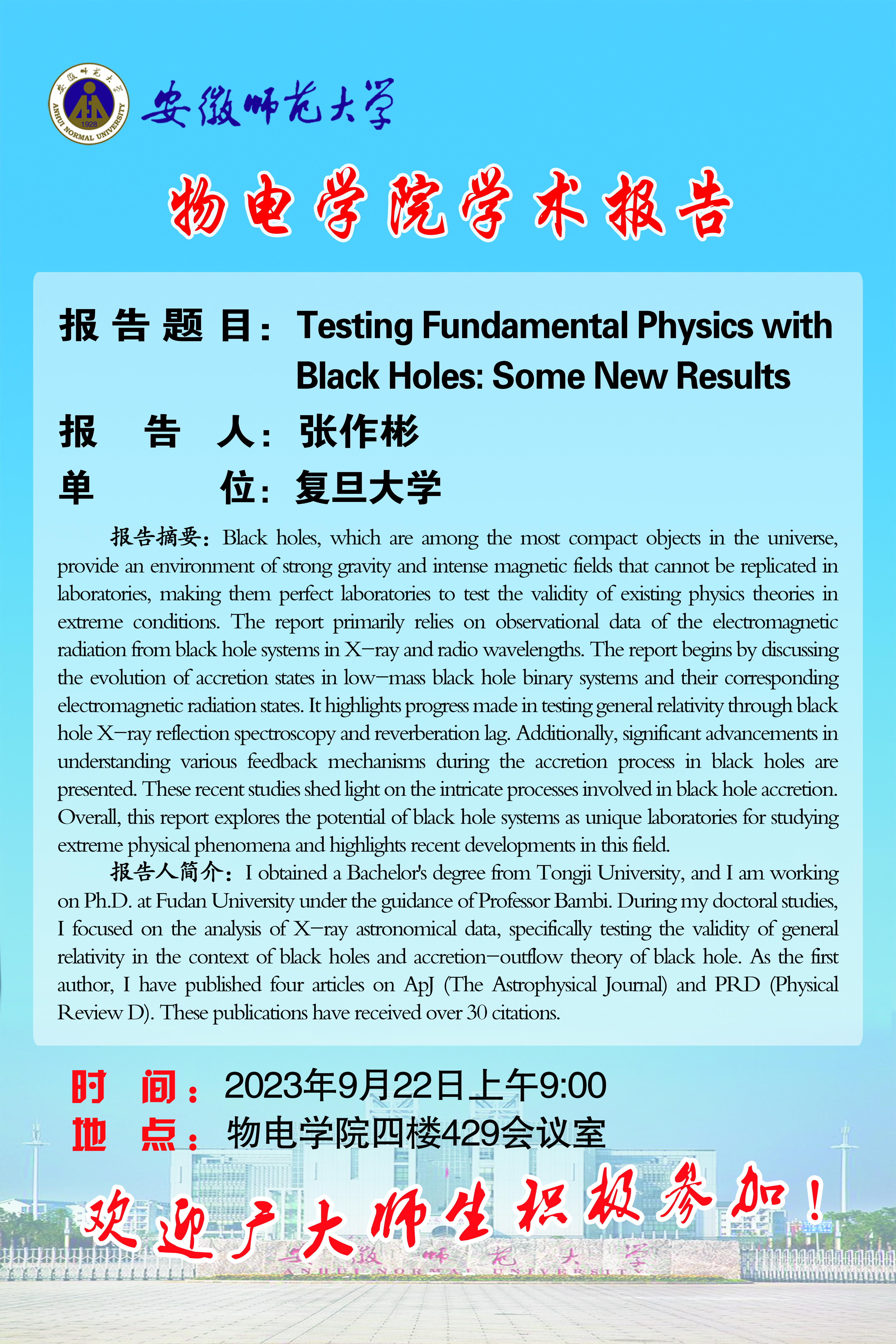 【学术预告·物电讲坛】张作彬:Testing Fundamental Physics with Black Holes: Some New Results
