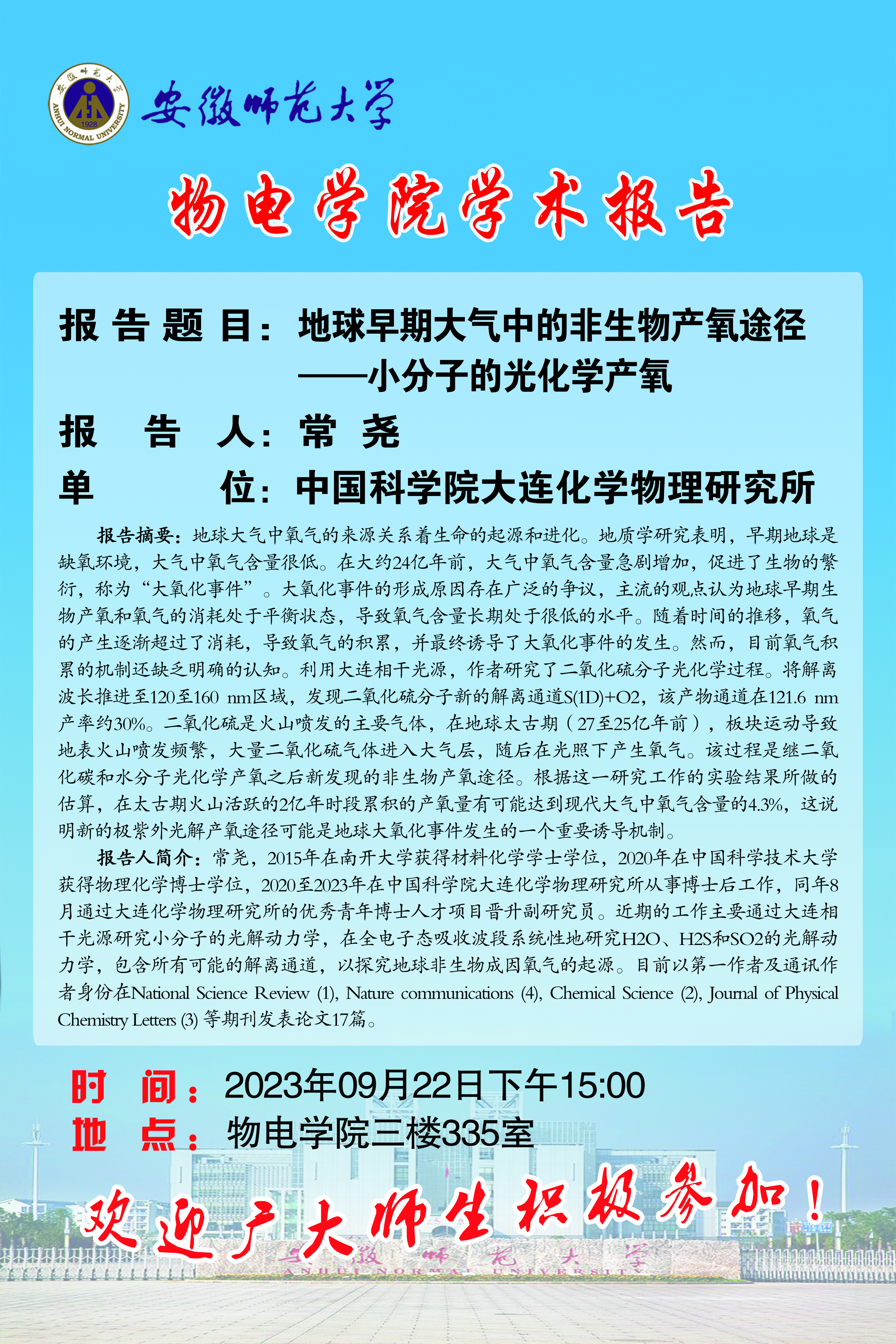 【学术预告·物电讲坛】常尧:地球早期大气中的非生物产氧途径——小分子的光化学产氧