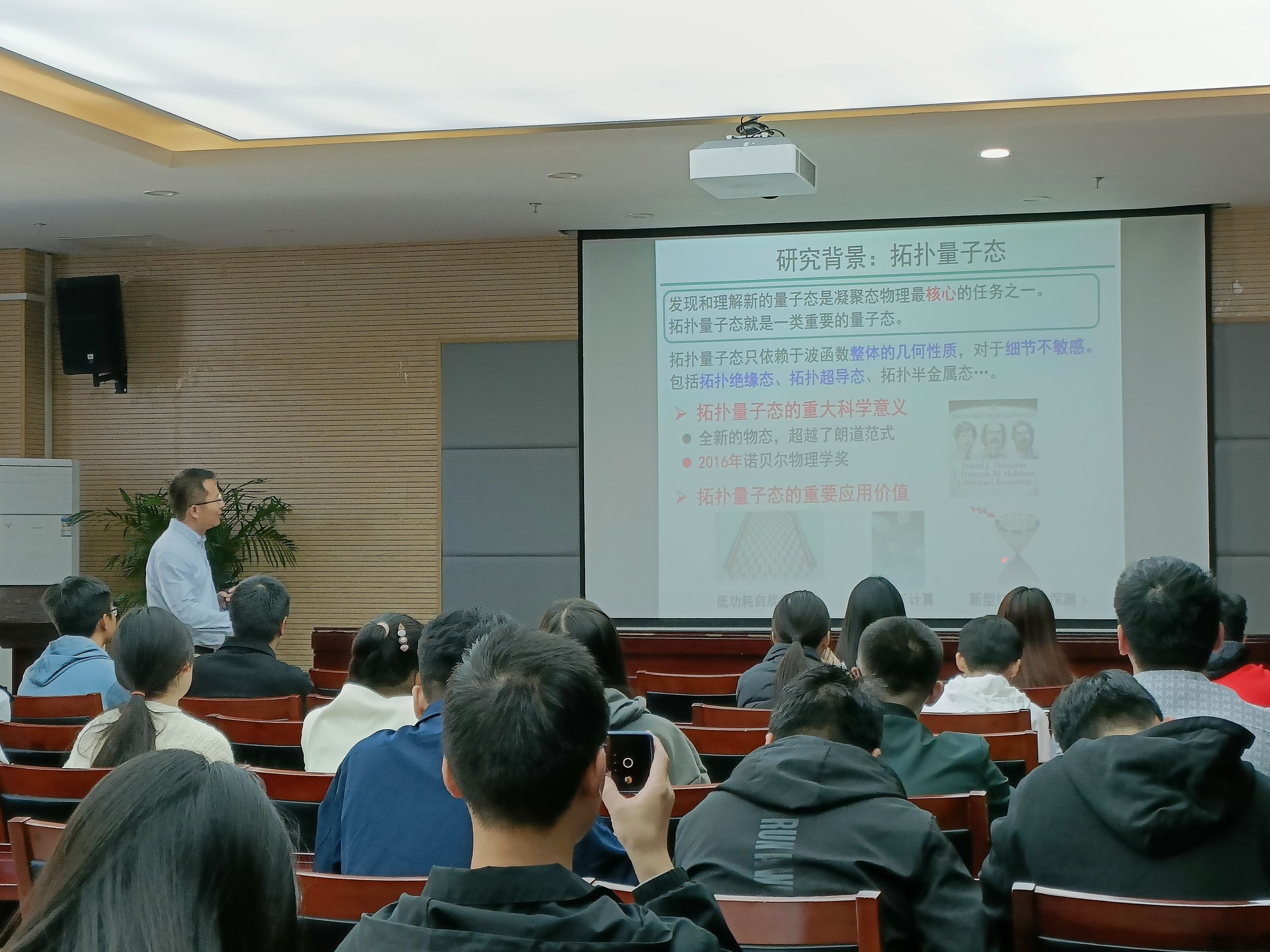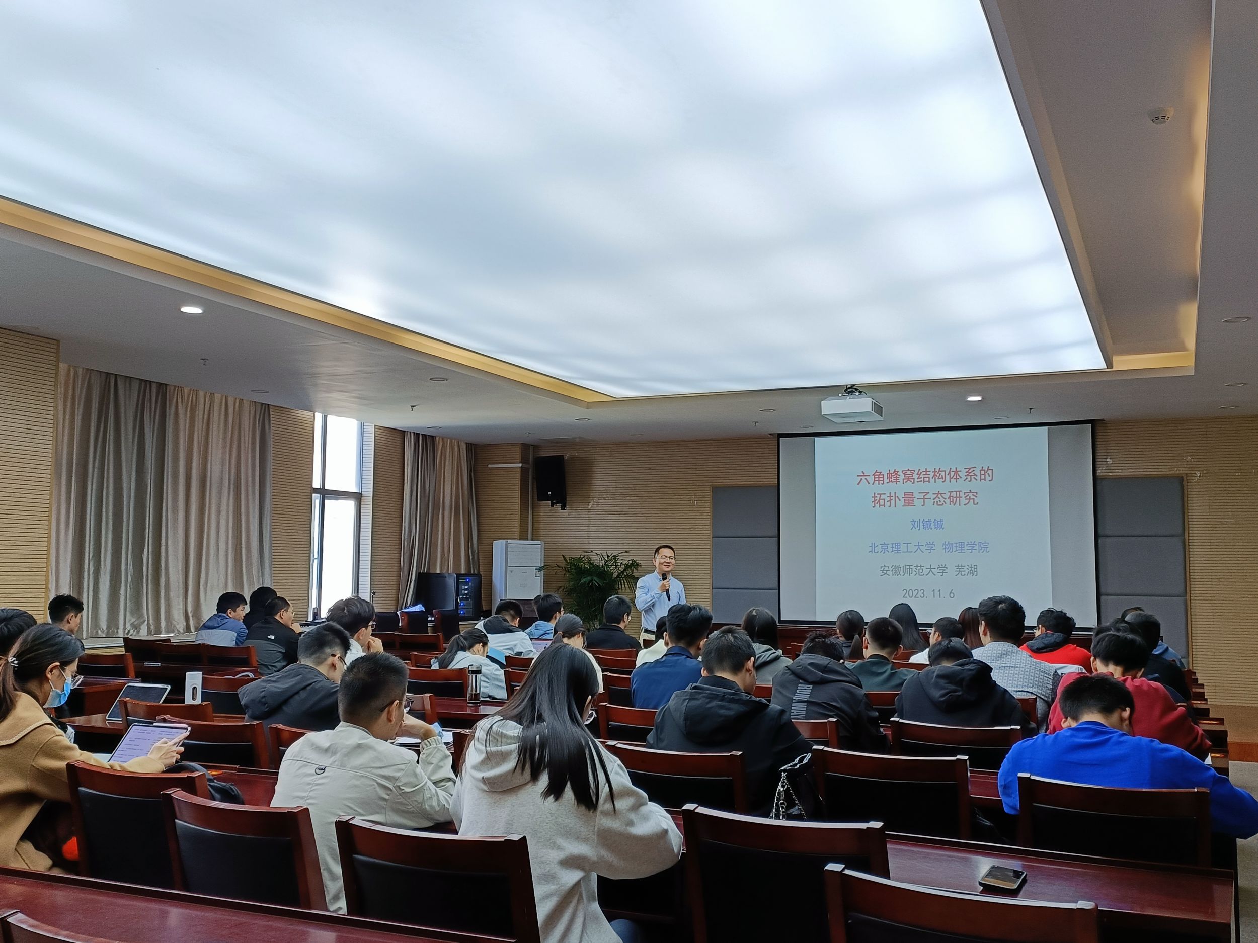 报告会上,刘铖铖教授做了题为《六角蜂窝结构体系的拓扑量子态研究》的学术报告。报告中,刘教授阐述了拓扑量子态和拓扑材料的研究背景及科学意义。同时,他结合课题组的相关工作同与会师生分享了二维大能隙拓扑绝缘体—硅烯、锗烯、锡烯,铋烷的理论预测和实验验证;二维高阶拓扑态的实现机制和丰富的材料预测;三维转角石墨烯中的高阶Z2狄拉克半金属态。