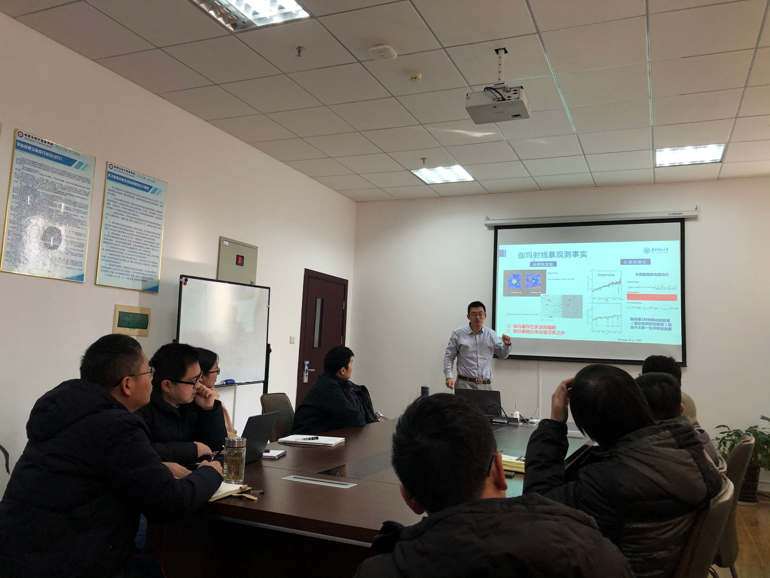 产生伽玛射线暴(简称伽玛暴)的喷流究竟以热能为主导还是以磁能为主导,是伽玛暴研究领域一个非常重要的未解问题。报告会上,高鹤教授结合课题组的研究工作详细介绍了如何围绕多个维度对磁能主导喷流模型进行检验,其中包括利用瞬时辐射光变曲线与光谱特征,光谱与辐射强度的统计特征,磁化因子分布等等。报告会结束后,与会师生就相关问题同高鹤教授展开了热烈讨论和交流。