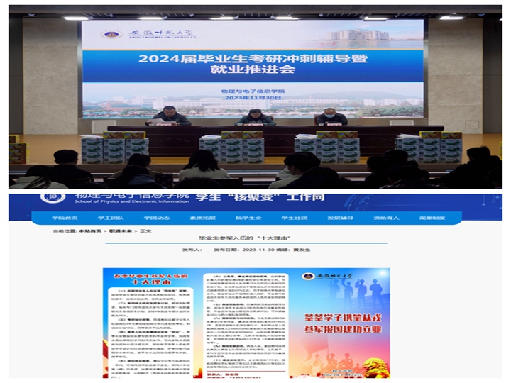 深化朋辈教育,榜样典型示范引领。征兵宣传过程中,学院积极联系优秀退役大学生士兵组建宣讲团,宣讲团成员通过主题宣讲、座谈会等形式进行个人筑梦军旅、卫国戍边感悟分享,以榜样力量引领毕业生将爱国之心转化为报国之行,从校园走进军营施展才华,实现青春价值。