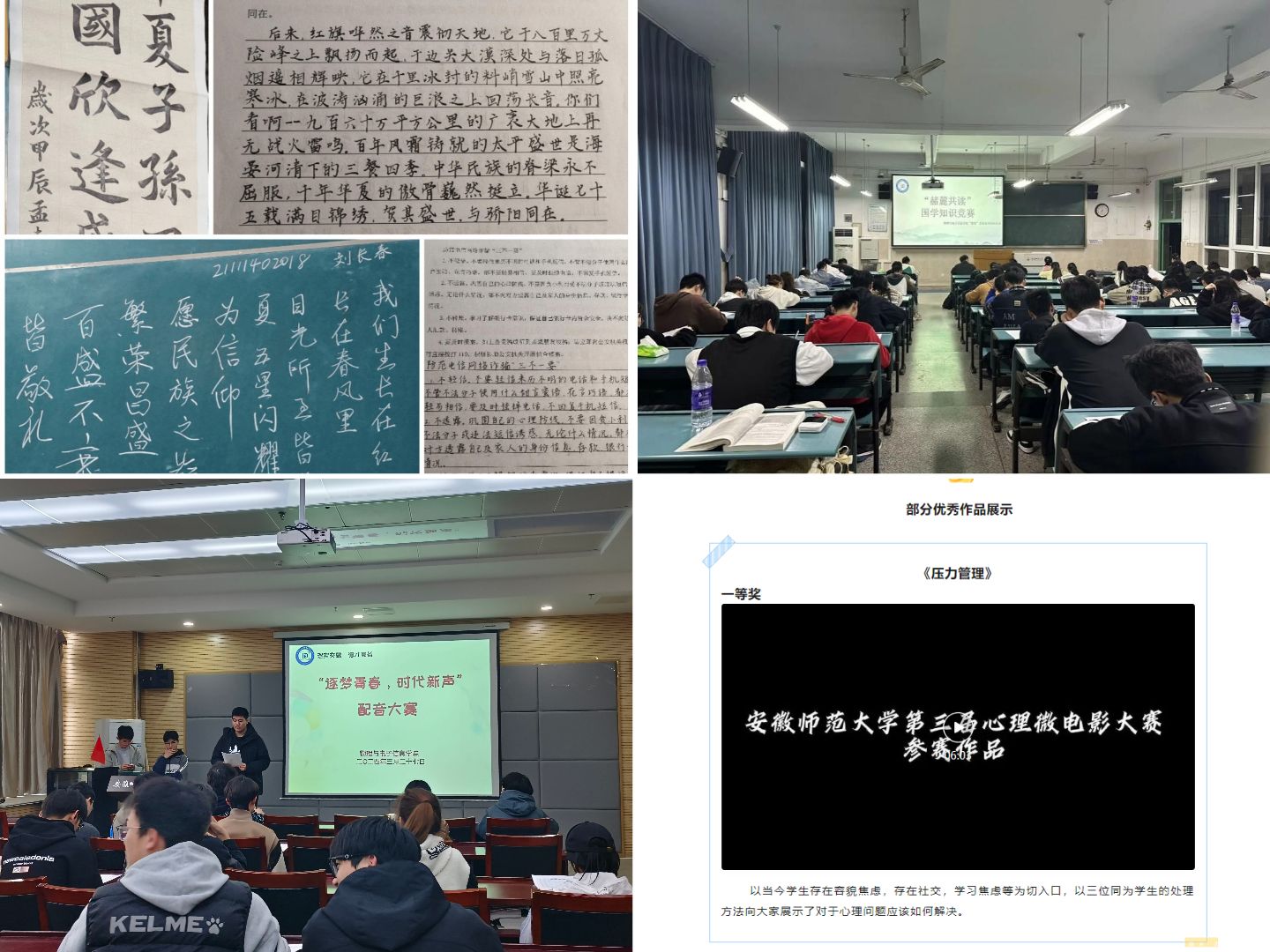 “以美润心”,美育丰富精神,艺术滋养心灵。学院举办第三届心理微电影大赛,各班级积极响应,共收集三十余部作品,经过学院辅导站老师和各班级同学代表进一步评议,《压力管理》作品荣获院级一等奖并推送至学校参加评比。学院还举办国学知识比赛、三字书法比赛、配音大赛等“聚变”青春系列活动,以丰富活动为载体,促进学生精神成长。