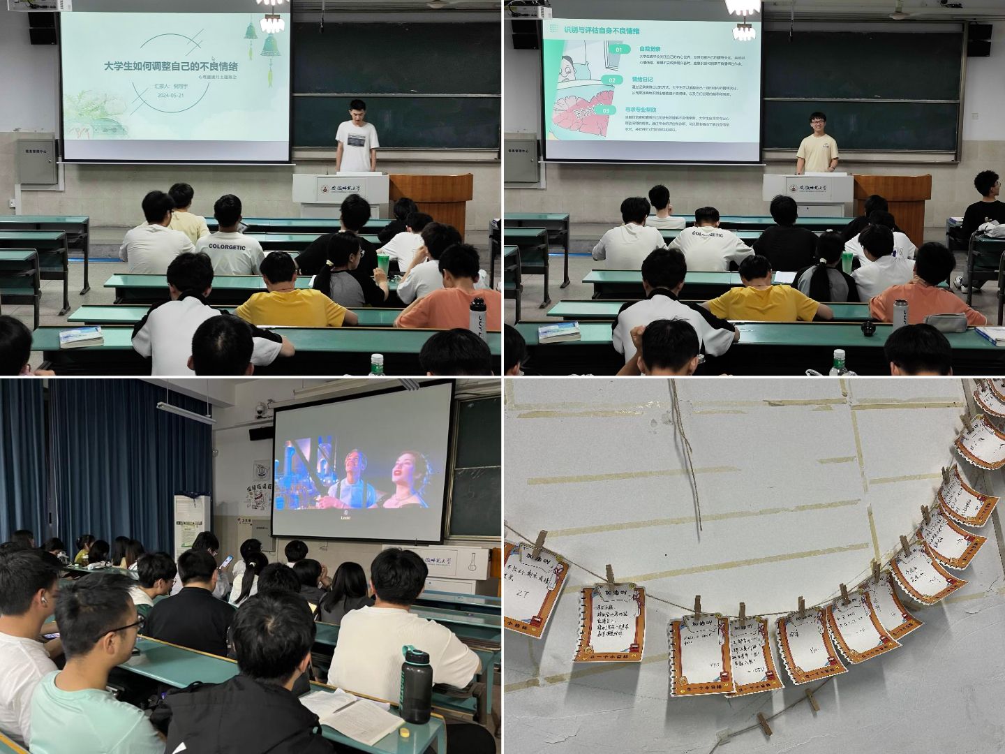 学子心理健康知识储备,增强个体心理健康自我评估、自我调节能力,学院各班级辅导员积极召开心理健康月主题班会,讲述心理健康概念、大学生常见心理健康问题以及疏导方法,营造班级阳光欢乐学习生活氛围。部分班级组织开展户外团体辅导活动,让同学们在欢声笑语中感到关怀与被关怀的幸福。此外,部分班级认真组织观影活动,“心理解忧卡片”活动,舒缓学业压力,丰富校园生活,绽放青春光彩。