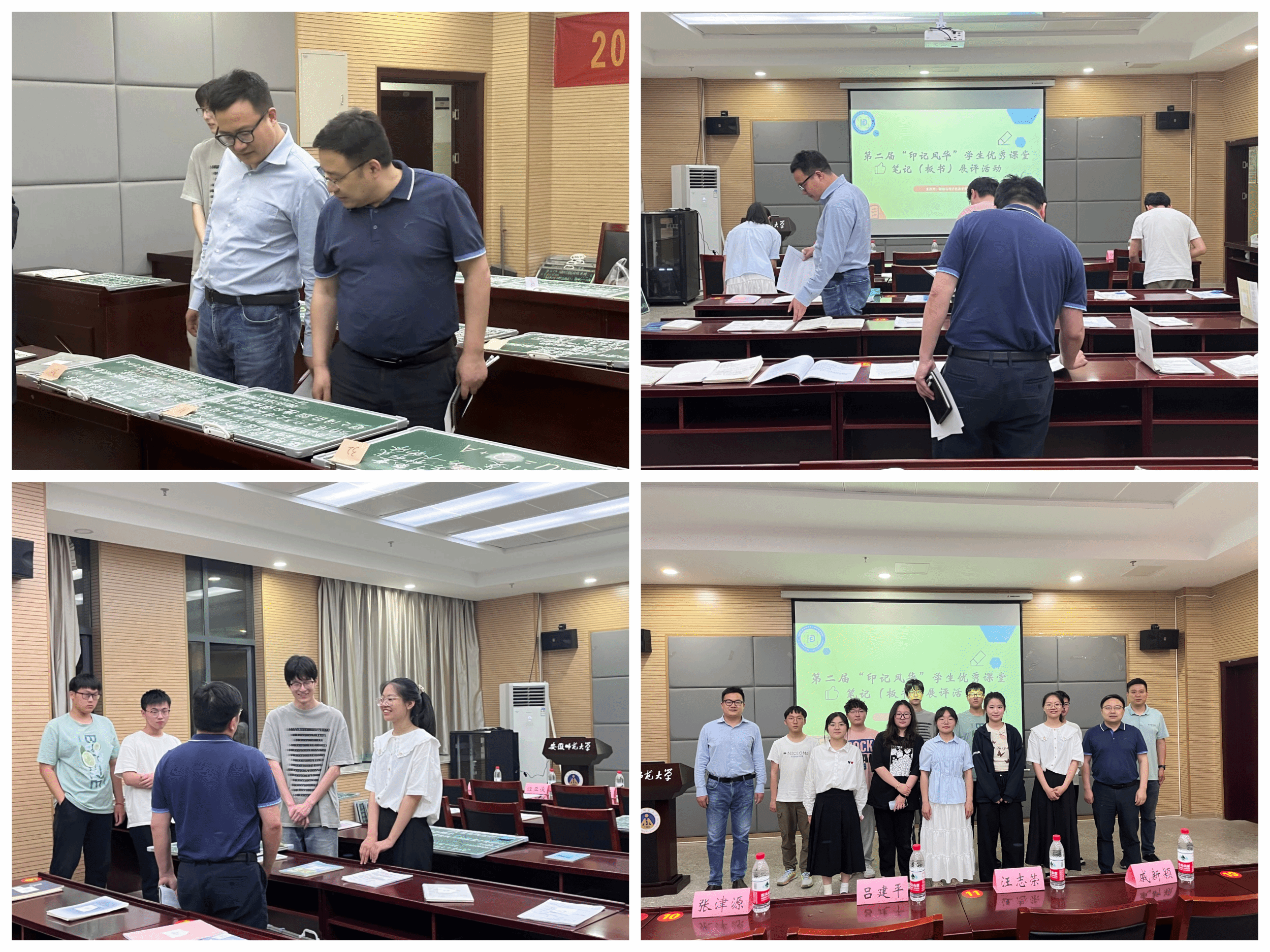 活动现场,各位专业老师和优秀学生代表根据两类作品编码顺序,采用现场评析的方式进行遴选。纸质笔记最终结果根据七位评委打分的均值排名得出,黑板经现场评分最终评选出一等奖8名,二等奖10名,三等奖12名。后续优秀课堂笔记和黑板板书也将于物电楼和学生宿舍进行展出,展现学子们勤奋好学的优良学风。