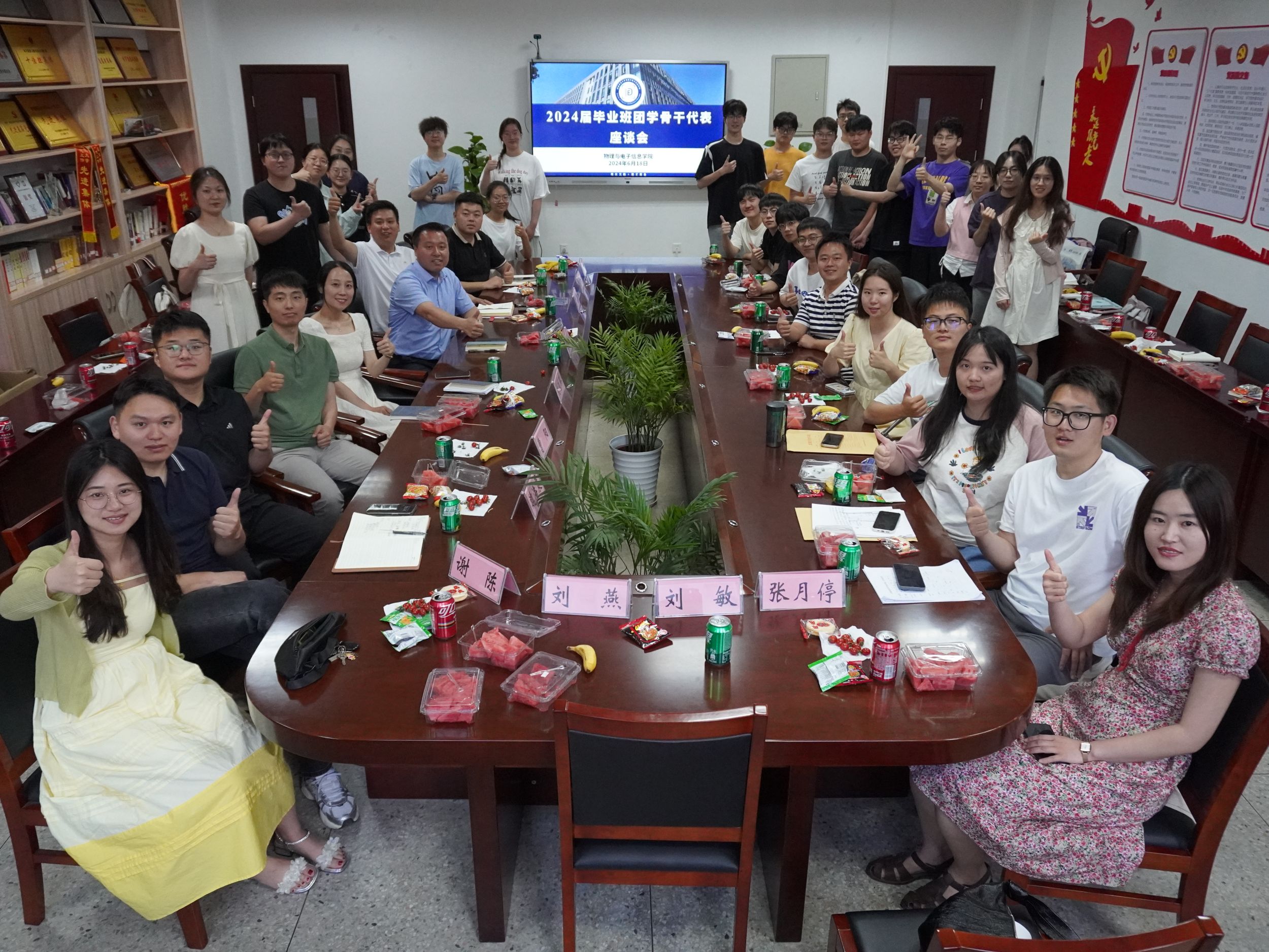 于6月18号下午在物理楼308会议室召开2024届毕业班团学骨干代表座谈会。学院党委副书记黄友生、毕业班辅导员、各团学组织指导教师、毕业班学生干部代表、现任学生骨干参加本次会议。座谈会由团委书记张津源主持。