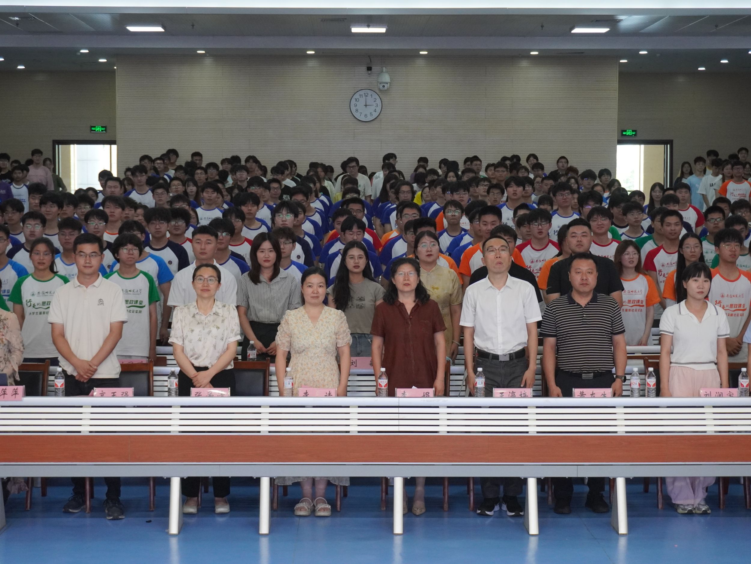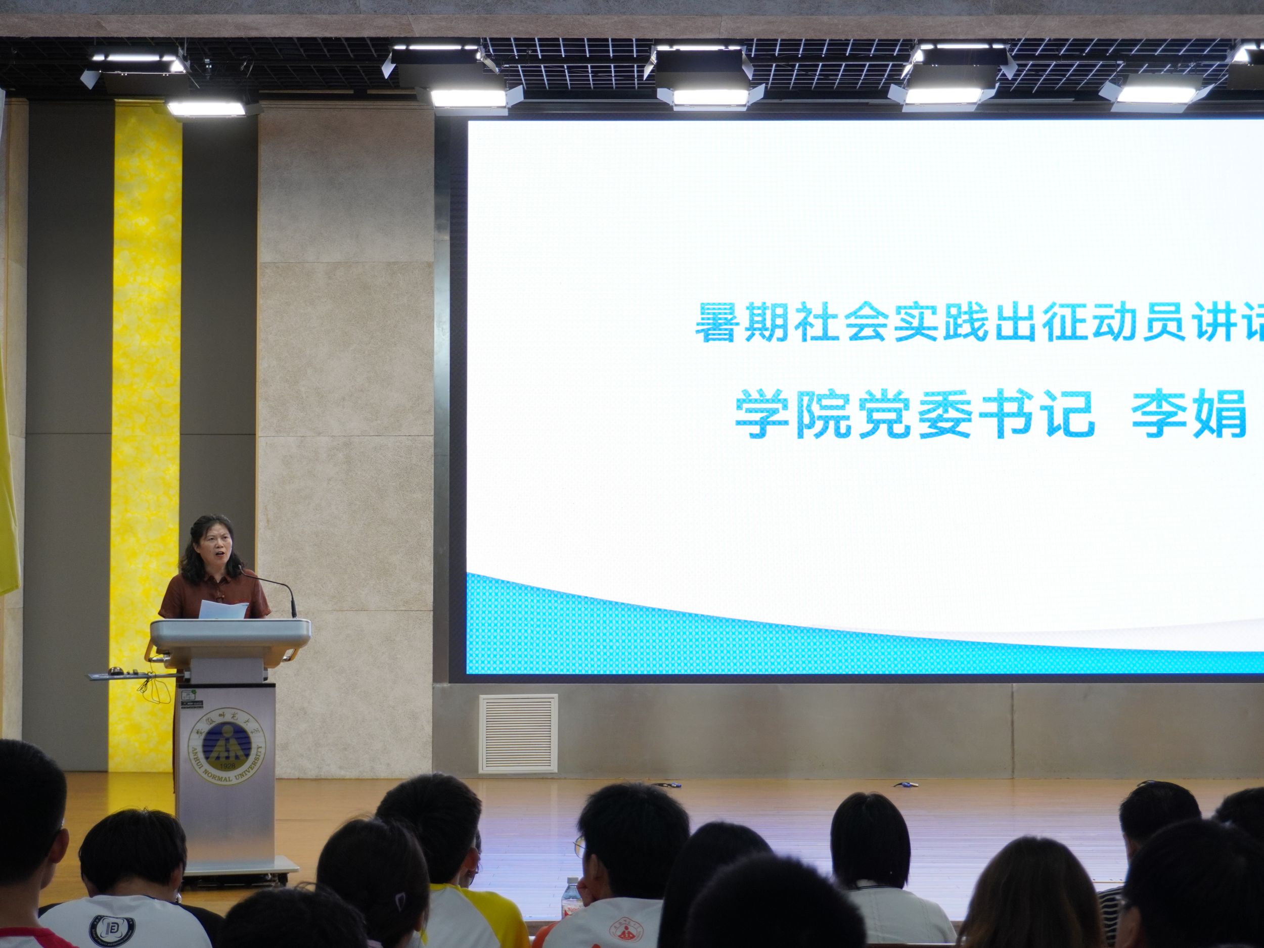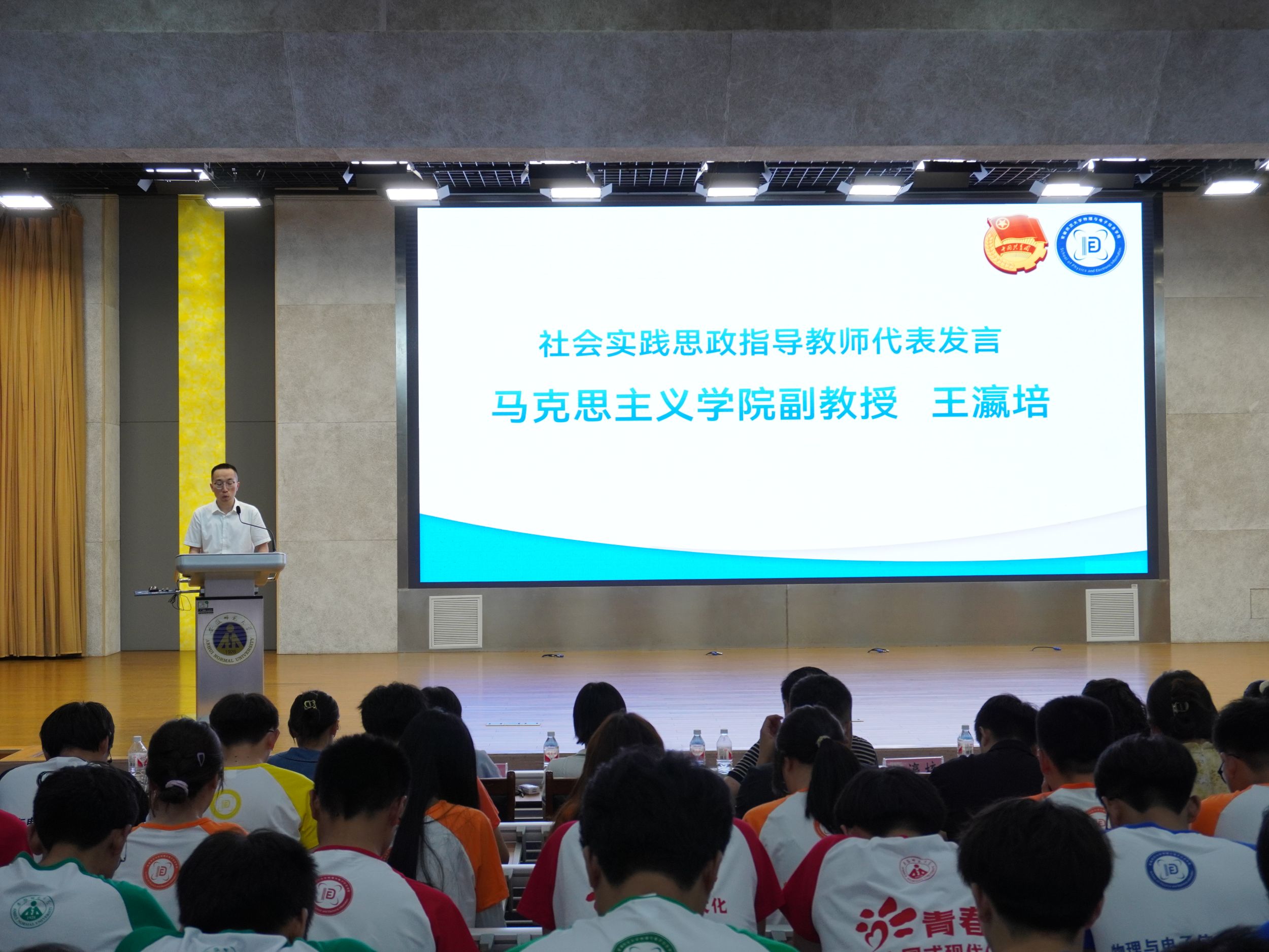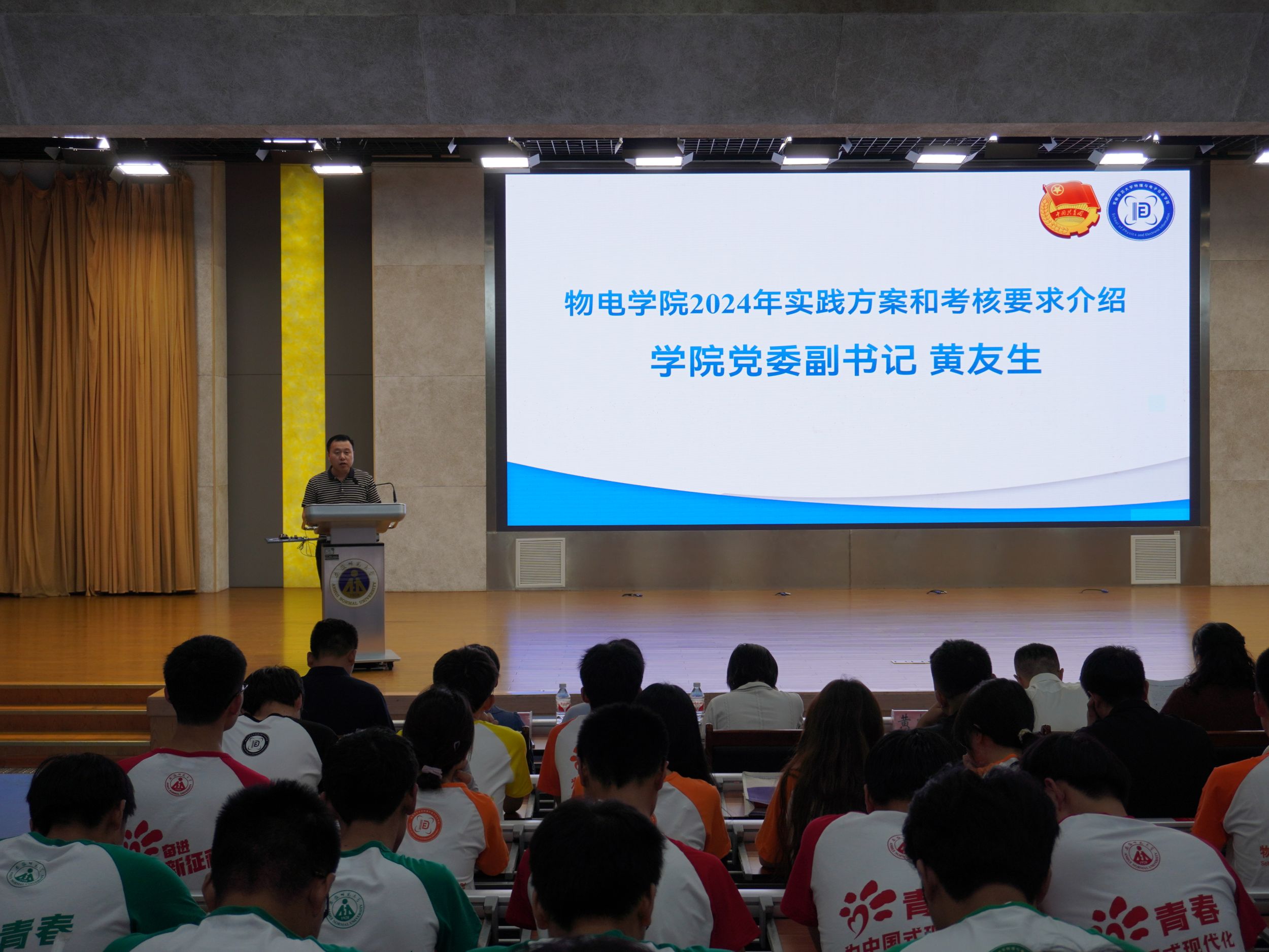在花津校区理科大楼报告厅举办“行走的思政课堂”2024年大学生暑期“三下乡”社会实践出征仪式暨专题培训会。我校2012级校友、安徽省新媒体集团安徽乡村振兴网主编刘润宇,校思政指导教师、马克思主义学院教师王瀛培、李靖,学院党委书记李娟,学院党委副书记黄友生,教学副院长张爱清,暑期社会实践指导教师代表、全体专兼职辅导员以及社会实践团体代表参加仪式。仪式由院团委书记张津源主持。