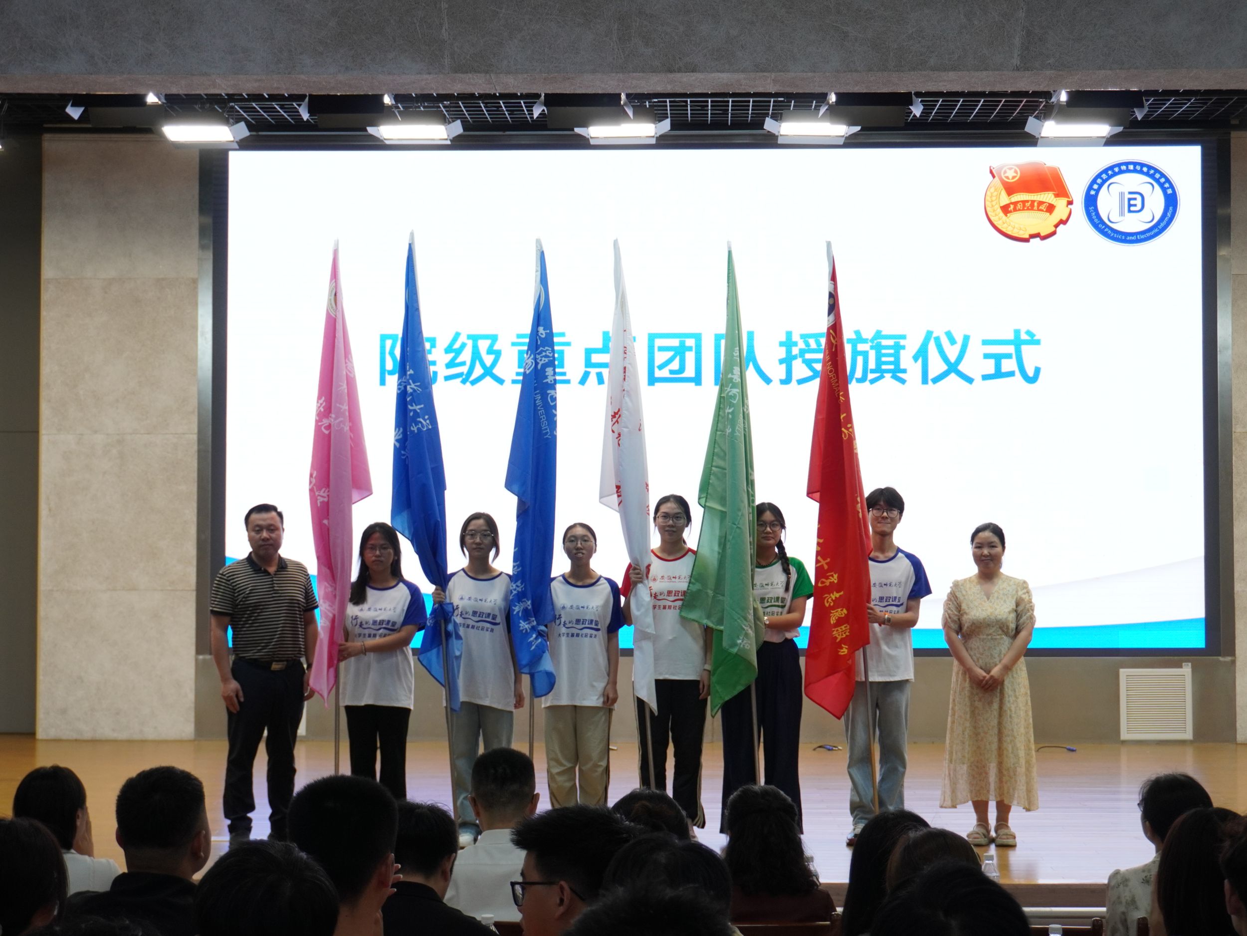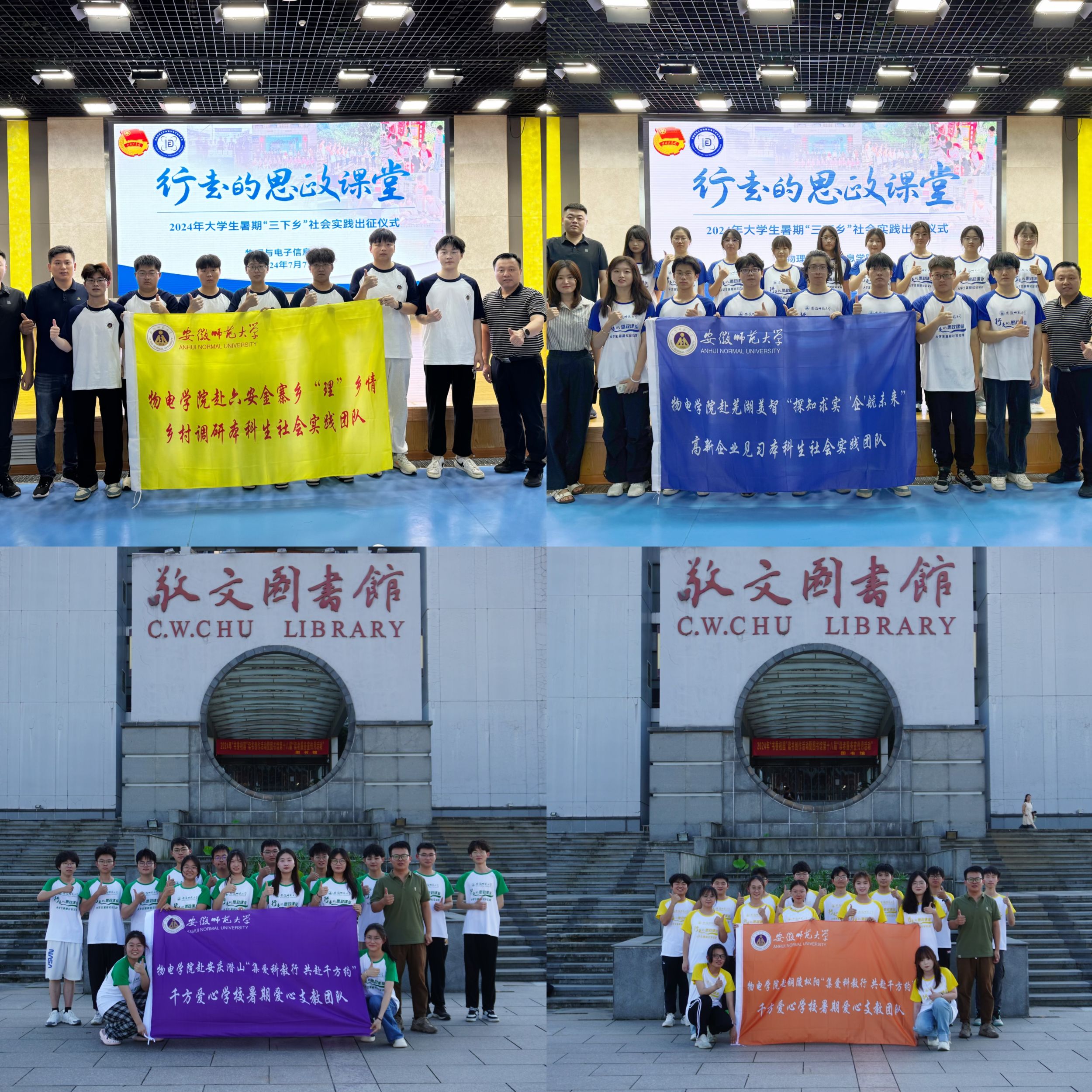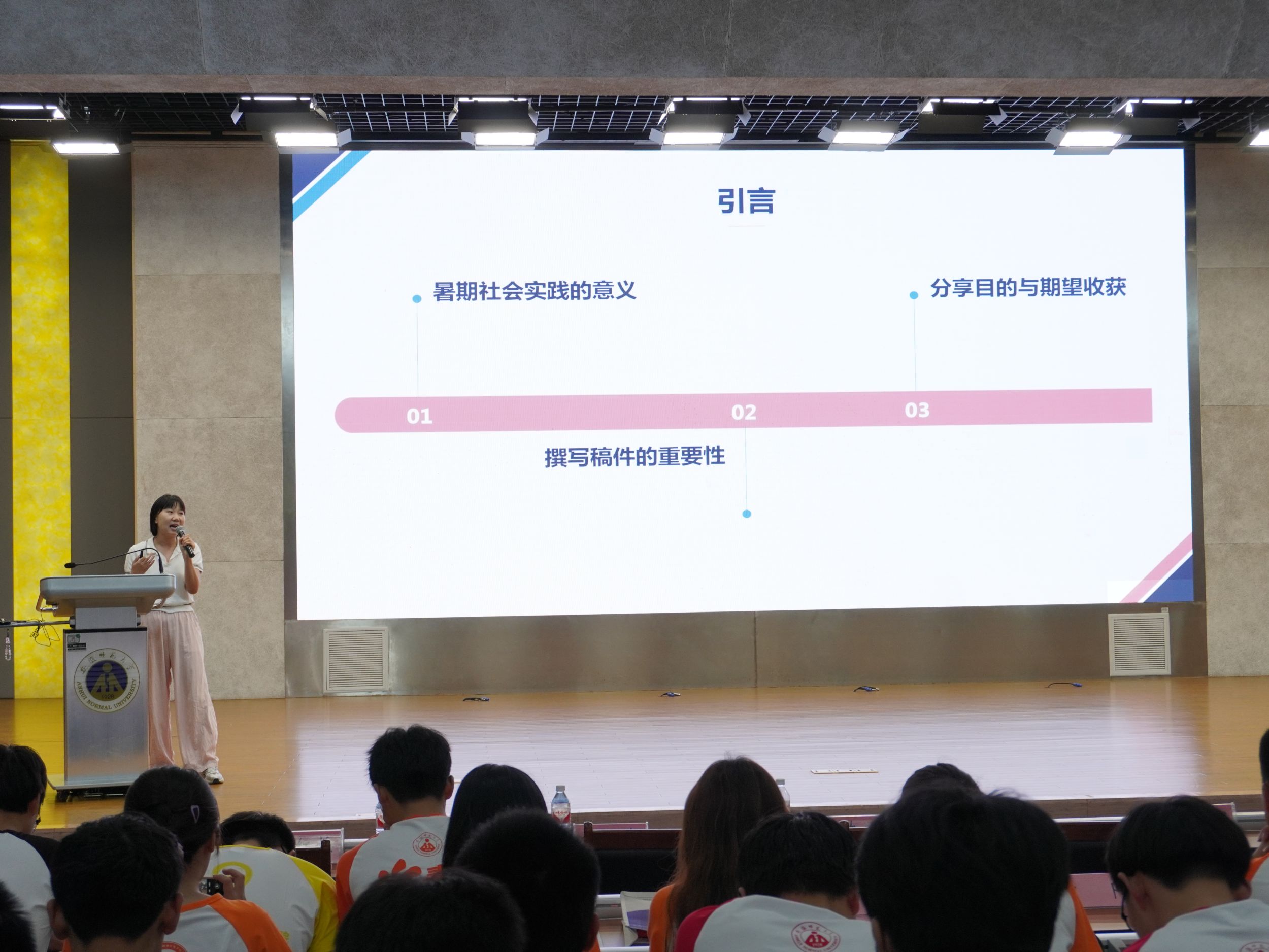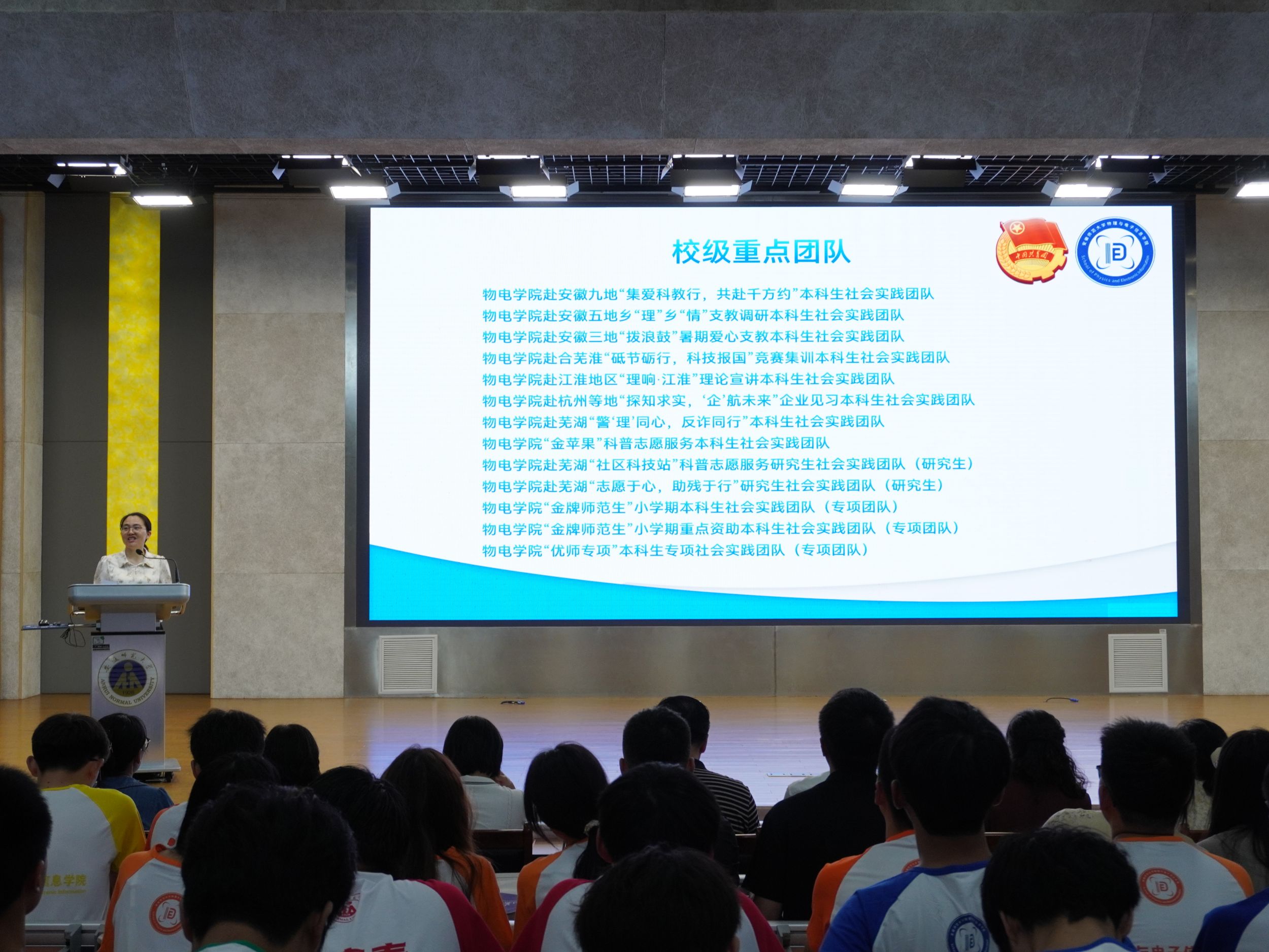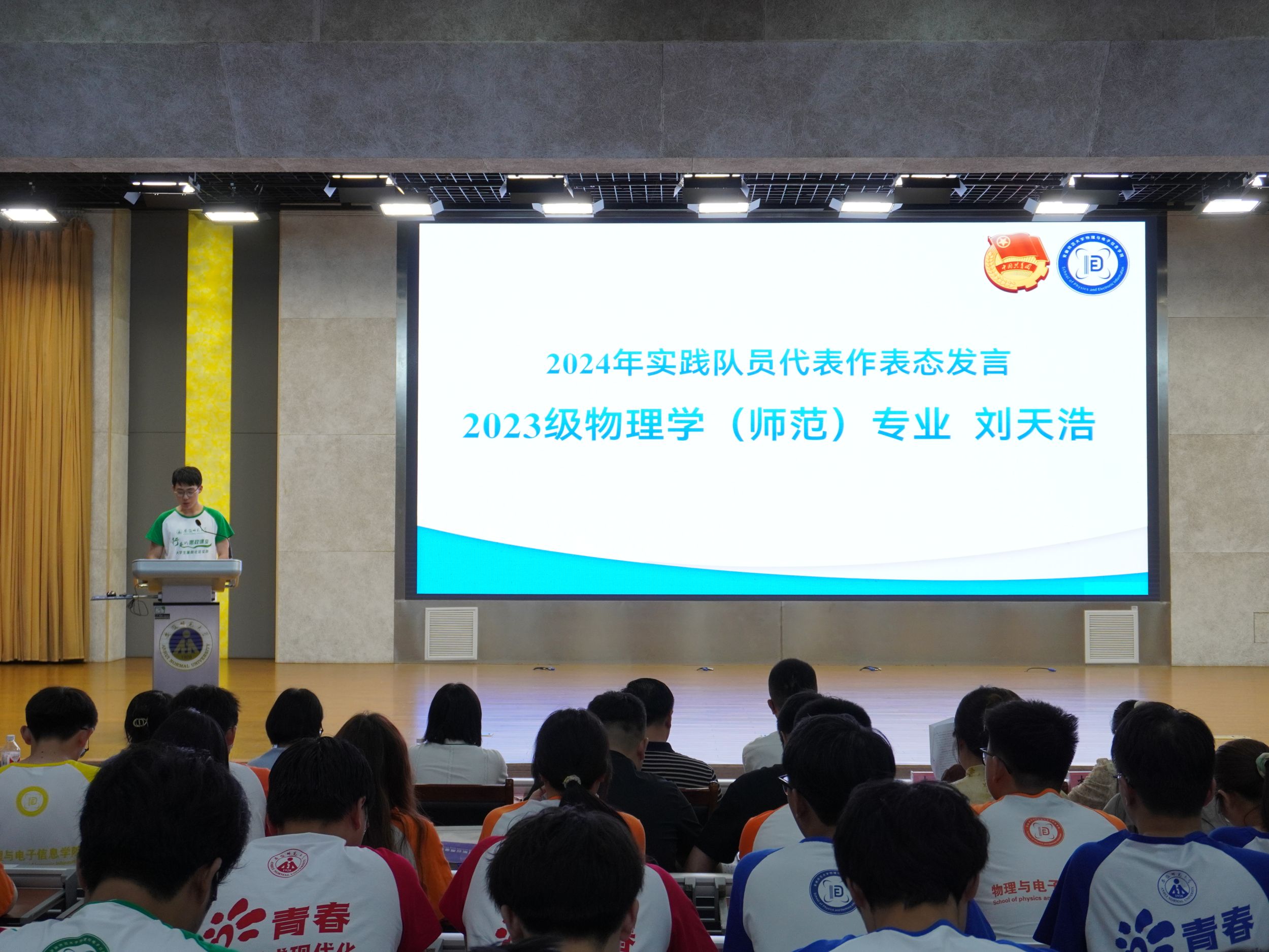 在花津校区理科大楼报告厅举办“行走的思政课堂”2024年大学生暑期“三下乡”社会实践出征仪式暨专题培训会。我校2012级校友、安徽省新媒体集团安徽乡村振兴网主编刘润宇,校思政指导教师、马克思主义学院教师王瀛培、李靖,学院党委书记李娟,学院党委副书记黄友生,教学副院长张爱清,暑期社会实践指导教师代表、全体专兼职辅导员以及社会实践团体代表参加仪式。仪式由院团委书记张津源主持。