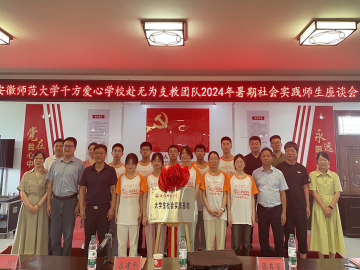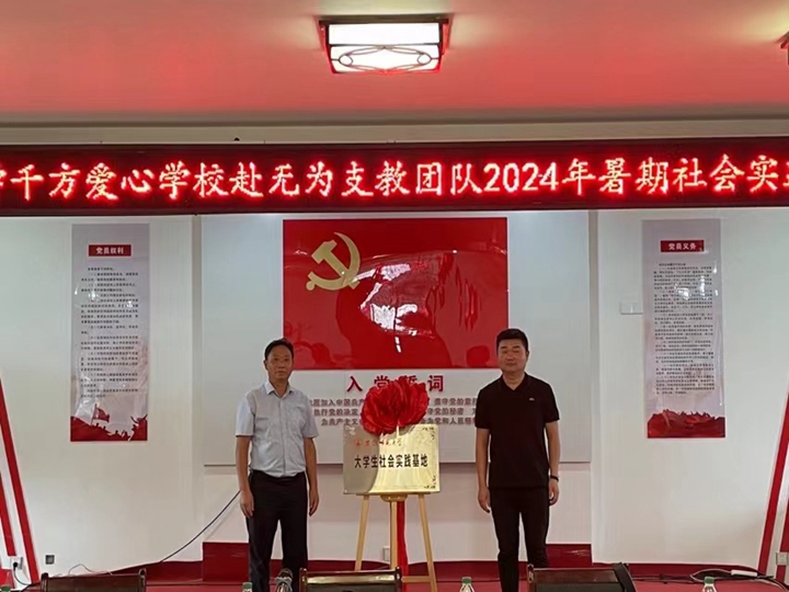 “集爱科教行,共赴千方约”千方爱心学校支教团队师生,并在日新村会议室举行大学生社会实践基地揭牌仪式。无为市委常委、组织部长陈兆强,团无为市委书记姚文敏,泥汊镇党委书记黎平安、党委副书记俞韵文,日新村党总支书记柯成等出席揭牌仪式。