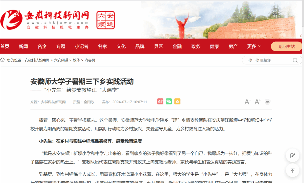 乡“理”乡情支教团队在安庆望江新坝中学和新坝中心学校开展为期两周的暑期支教活动,用实际行动助力乡村振兴,关爱留守儿童,为乡村教育注入新的活力。