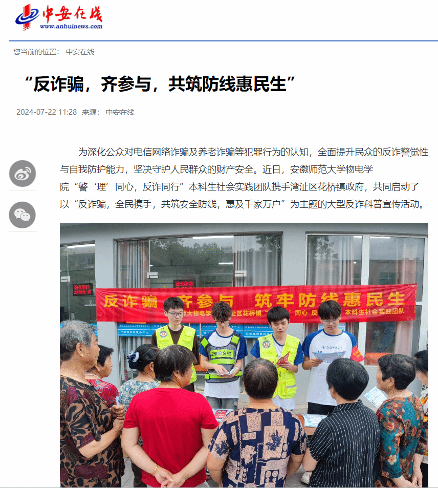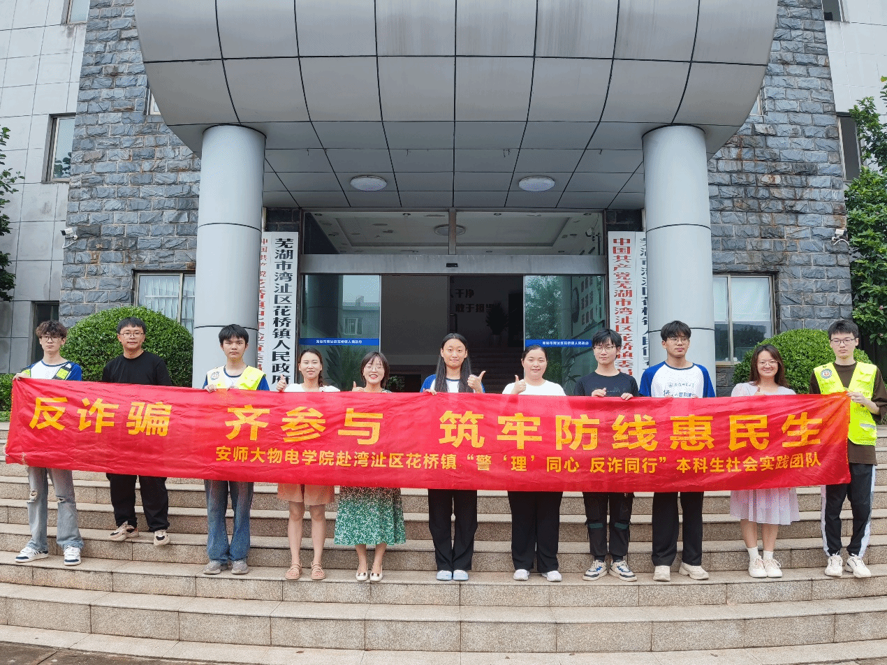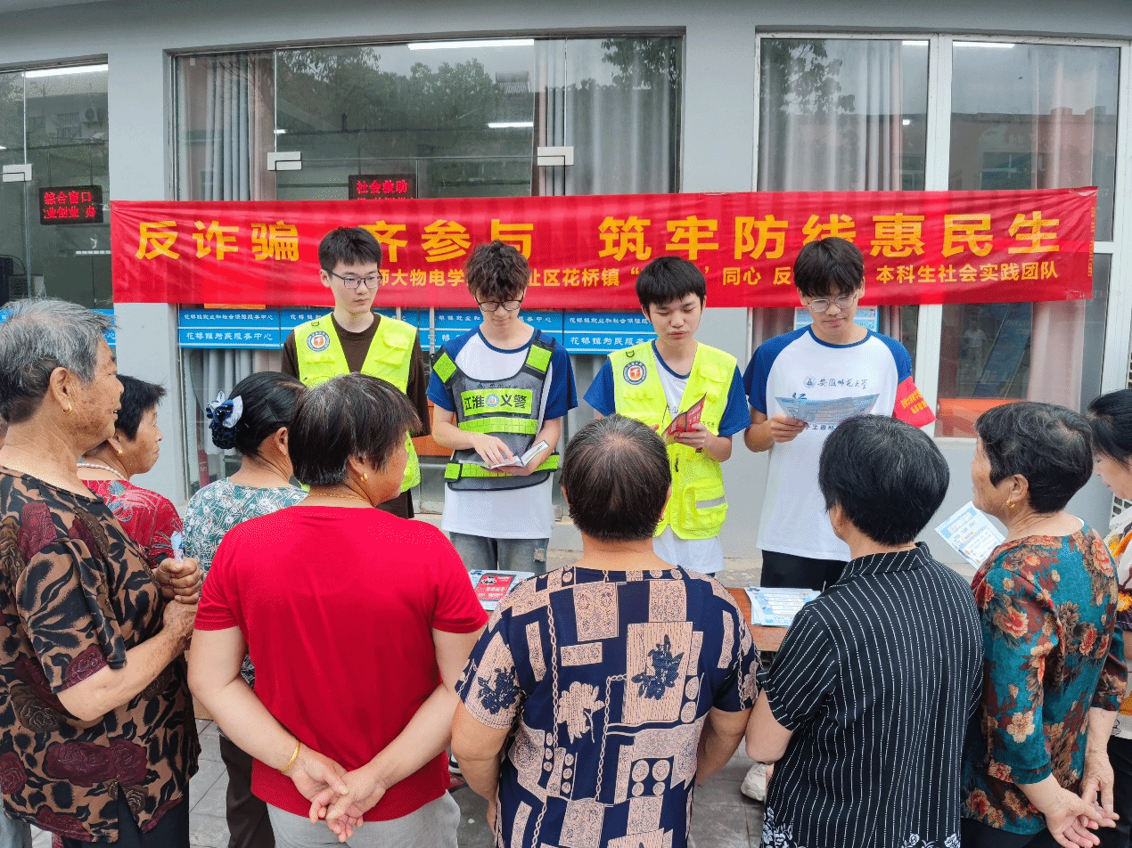 “警‘理’同心,反诈同行”本科生社会实践团队携手湾沚区花桥镇政府,共同启动了以“反诈骗,全民携手,共筑安全防线,惠及千家万户”为主题的大型反诈科普宣传活动。