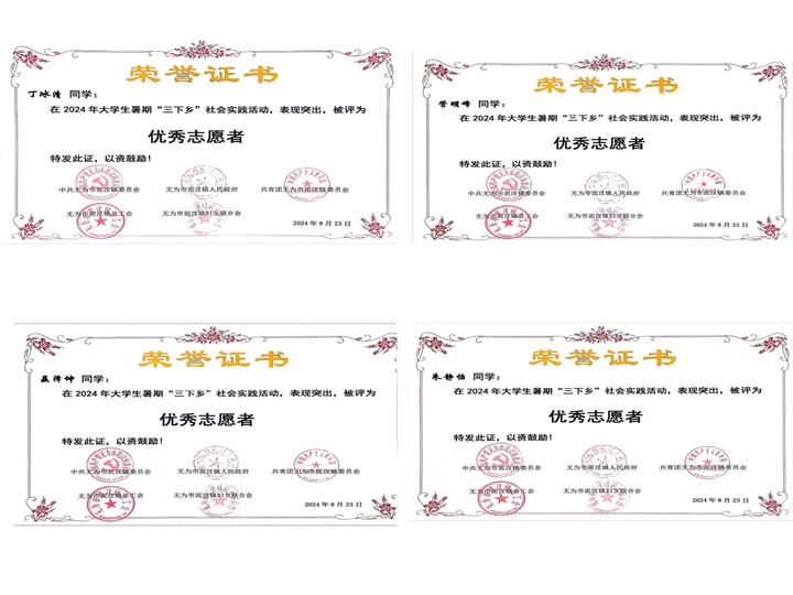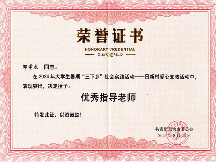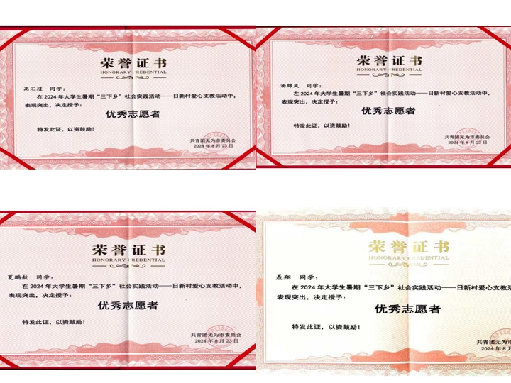辅导员邹孝龙被评为“优秀指导教师”,聂翔等同学被评为“优秀志愿者”。泥汊镇党委授予丁冰清等同学“优秀志愿者”荣誉称号。
