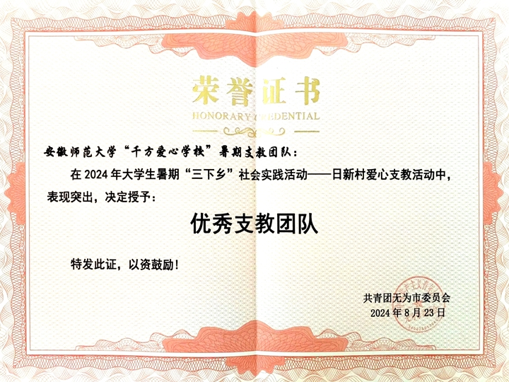 近日,团无为市委表彰我校“千方爱心学校”暑期社会实践团队师生。“千方爱心学校”暑期社会实践团队在2024年无为市大学生暑期“三下乡”社会实践活动中表现突出、成效明显,团无为市委决定授予“千方爱心学校”“优秀支教团队”称号,包子漫画