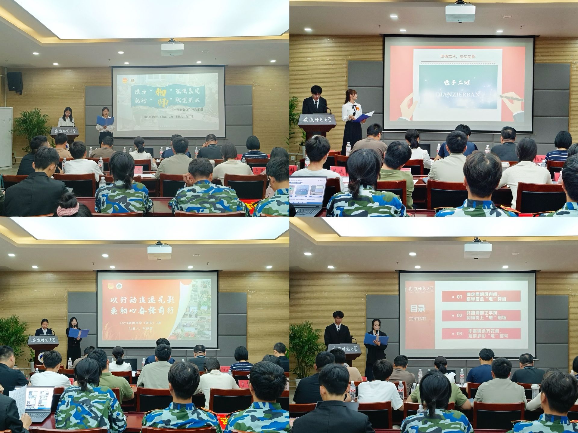 展评会上,13个申报班级、团支部学生代表依次上台汇报,利用演示文稿展示了他们在组织建设、思想引领、实践创新、学风培养等方面付出的努力及取得的成效。2021级电子信息工程以“锤炼青春电板路,电亮科创芯力量”为题,讲述电子人追求创新、力求卓越的奋斗历程;2022级物理学拔尖人才班围绕“务实、拔尖”这一主题,以“起始点”“坐标系”“激发态”“原子能”自喻,讲述物理学子在学业、科研、竞赛和实践等方面的创建成果;2023级物理学(师范)1班从“向下扎根,向上生长”“向外探寻,向内思考”“向美而立,向光而行”三个维度,展示凝心聚力打造的优秀班集体。各参评集体立足学校大学生护航行动计划采取的创新举措、取得的良好成果得到了评委老师和学生代表的肯定,赢得了阵阵掌声。