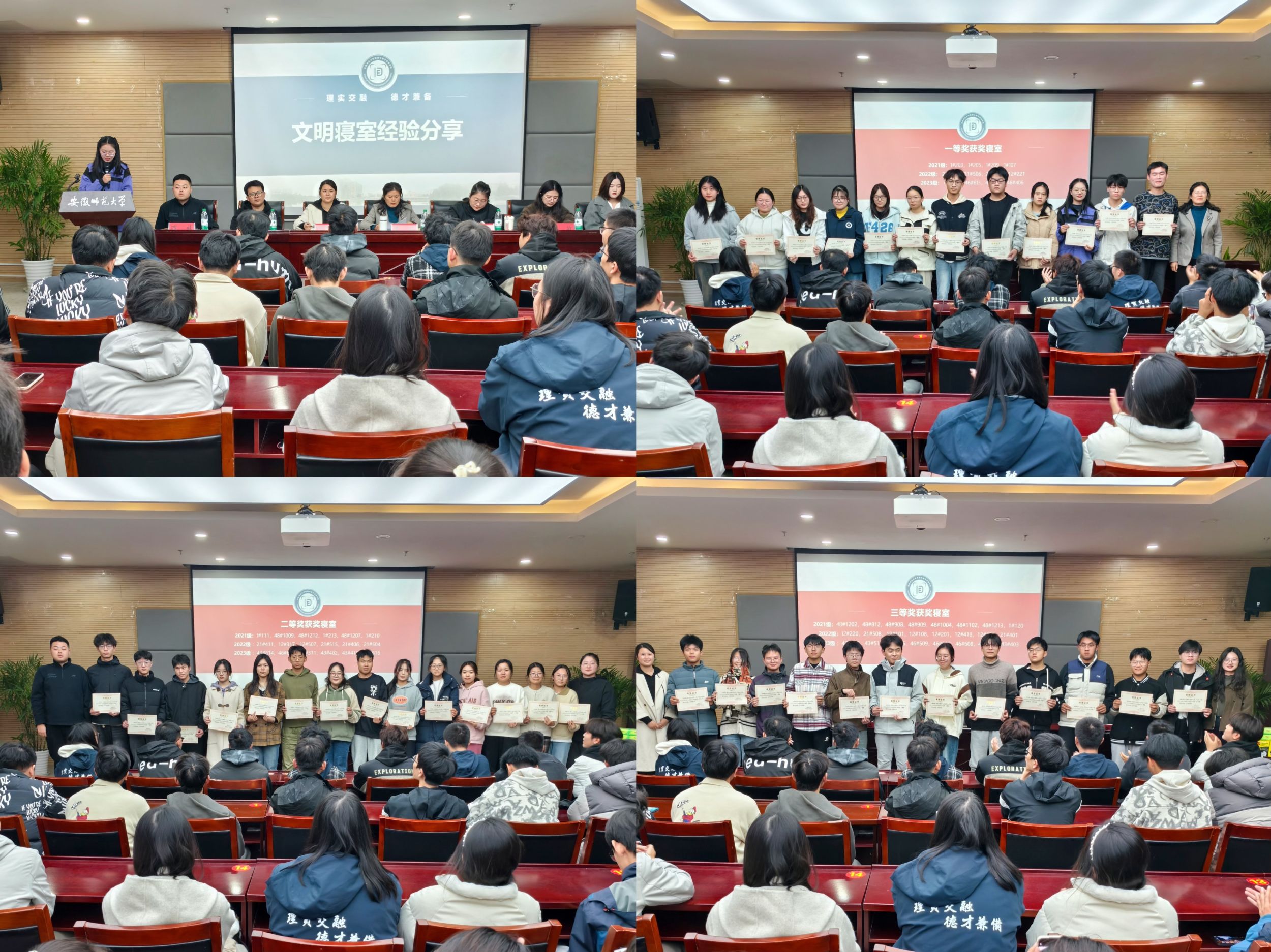 会议伊始,学院学生会通报了2023-2024学年学院卫生督导情况,一学年累计检查寝室2700余间,通报表扬216间优秀寝室,通报批评135间脏乱差寝室,本次在21、22、23三个年级共表彰一等奖寝室12间、二等奖寝室18间、三等奖寝室24间。文明寝室代表许冉冉、钱墉从内务整理、寝室安全与和谐关系三个方面分享了经验,畅谈了文明寝室创建的重要性。随后,李娟等人为2023-2024学年获奖的优秀文明寝室代表颁发了证书和奖品。李娟在总结讲话中对获奖寝室表示祝贺,她表示,文明宿舍建设对塑造学生精神风貌具有深远影响,同时也是落实学校“六个文明”教育实践活动的重要举措,全体寝室在生活中要注重学习引领、讲究方法、自我控制和示范带头,共同把宿舍建设成文明和谐的“小社会”,温馨友爱的“小家庭”和共同进步的“小课堂”。
