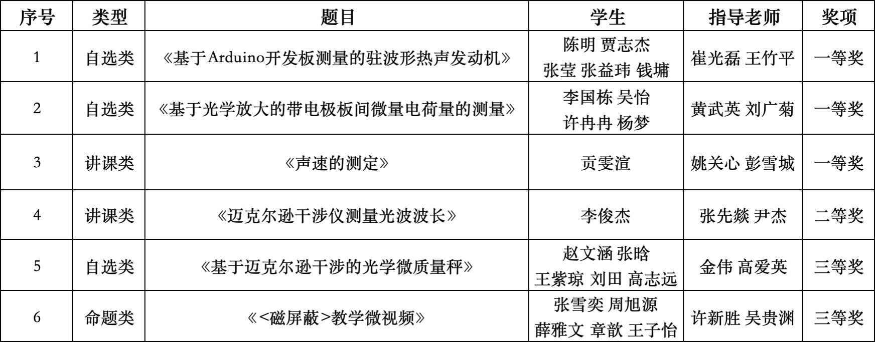 学校对本次赛事予以高度重视,自备赛活动启动以来,教务处等相关部门给予全方位支持,包子漫画 精心组织多轮集训,参赛团队师生全力打磨作品。经过校赛初审、国赛线上评审等环节的重重考验,最终,自选类《基于Arduino开发板测量的驻波形热声发动机》、《基于光学放大的带电极板间微量电荷量的测量》和讲课类项目《声速的测定》三个项目荣获全国一等奖。此外,讲课类《迈克尔逊干涉仪测量光波波长》获得全国二等奖,自选类《基于迈克尔逊干涉的光学微质量秤》和命题类《<磁屏蔽>教学微视频》获得全国三等奖。