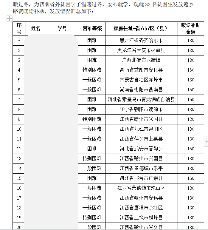 “暖途”车票,隐形资助用真心。通过智慧思政大数据分析,辅导员精准核实,学院为家庭所在地为黑龙江、内蒙古、广西等边远地区或省外的贫困生“悄悄地”发放返乡路费“暖途”补贴,保驾护航学子的返乡旅途。考虑到毕业季异地奔波求职花销的问题,学院为经济困难的毕业生提供求职就业交通、住宿补贴,用真情、真心、真爱护航毕业生,温暖求职路。