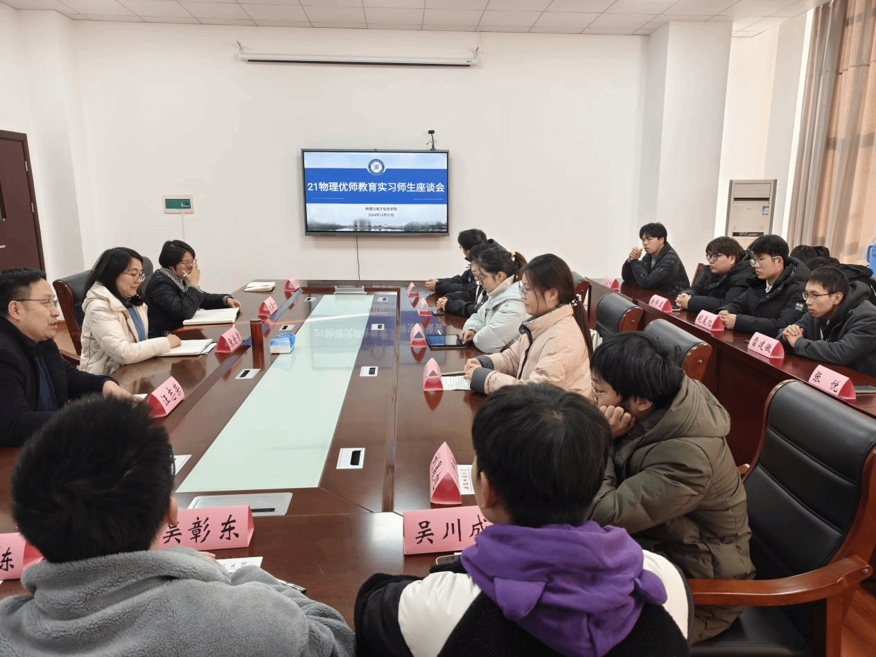 12月31日下午,2021级物理学优师计划专业在物理楼139会议室开展教育实习总结师生座谈会。学院教学副院长张爱清、教研室主任汪志荣、教育实习指导老师徐玲、优师专业班主任赵春一、辅导员刘冠琪以及优师专业在校全体学生参会。