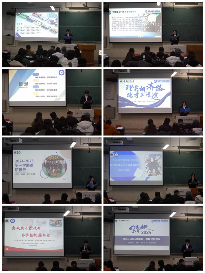 学生会工作人员述职评议工作办法》,结合上一学期的重点工作,围绕政治态度、道德品行、学习情况、纪律作风、工作成效等五个方面按照顺序依次展开述职汇报,在展示工作成果的同时沉淀工作经验,展望新学期工作愿景。院学生会主席团成员许冉冉提出“以品牌活动为载体,打造实践育人‘主阵地’,以朋辈互助为桥梁,做好全面发展‘领航员’”;院文艺体育部负责人牛润涛表示“要在学思践悟中精进个人本领、在履职尽责中强化工作落实、在反思总结中明确发展目标”。