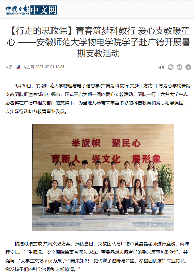 “集爱科教行 共赴千方约”千方爱心学校暑期支教团队抵达宣城市广德市,正式开启为期一周的爱心支教活动。团队一行十六名大学生志愿者将在广德市相关部门的支持下,为当地儿童带来丰富多彩的科普教育和素质拓展课程,以实际行动助力教育事业发展。