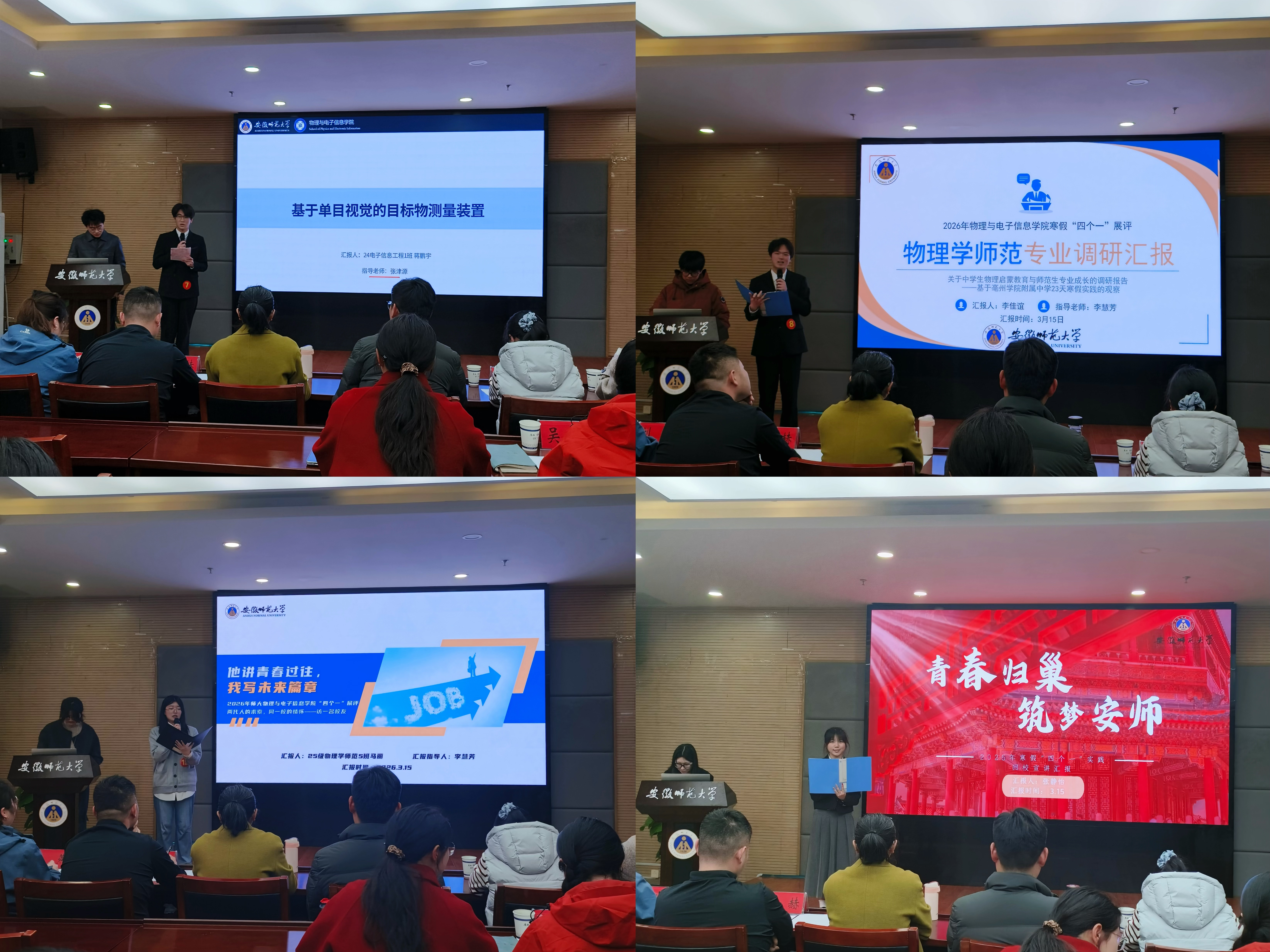 展评会上,参评同学依次登台,围绕各自的实践经历与成长收获进行汇报。他们中,有的投身志愿服务一线,参与社区环境整治、禁燃禁放宣传,用行动诠释青年的责任与担当;有的坚持以阅读为伴,在经典作品中体悟时代使命,从书香中汲取前行的力量;有的聚焦专业前沿,将课程所学应用于科创实践,在探索中不断提升科研素养;有的走访优秀校友、回访高中母校,在两代人的交流中传承校情、明确方向。各类实践内容各有侧重,但无不展现出师大学子知行合一、积极进取、服务社会的精神风貌,也充分体现了学院实践育人的丰硕成果和青春风采。