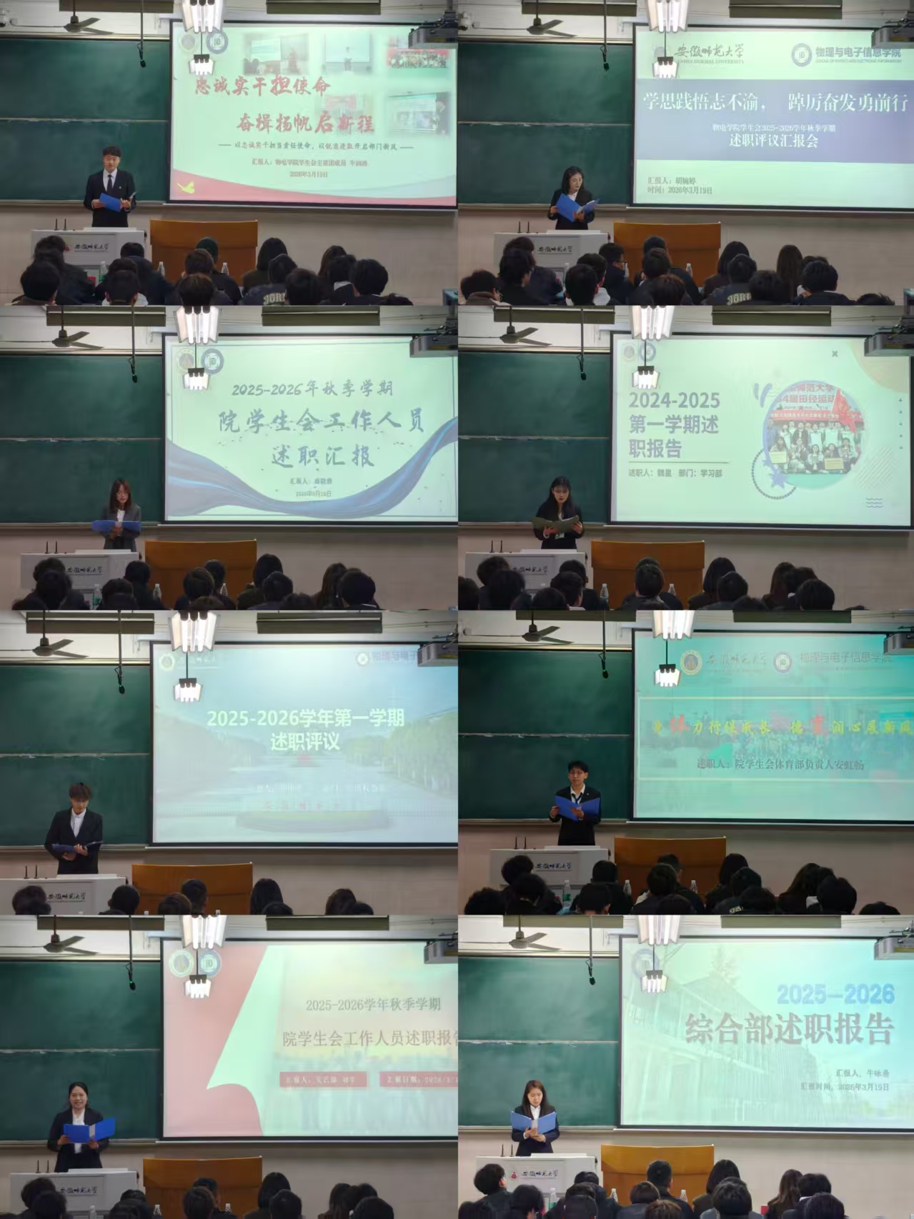 学生会2025-2026学年秋季学期工作人员述职评议汇报会在行知楼2号楼103教室顺利召开。院团委书记布赫老师、院学生会指导教师邹孝龙老师、电子爱好者协会指导教师张月停老师、校学生会代表苏晨旭、学院团委学生副书记吴雲出席汇报会,出席本次会议的还有学院学生会主席团成员、各部门负责人、院学生会全体工作人员、各班班长和学生代表。会议由学院学生会工作人员李亮主持。