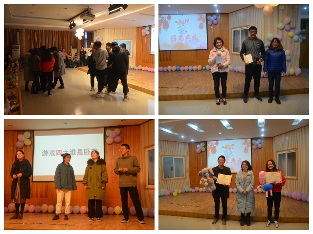 晚会节目中间穿插的小游戏也是几度带动全场氛围上攀,熟悉的游戏套路却依旧吸引着大家,得到积极参与:你画我猜中灵魂画手的出现赢得满堂喝彩,西瓜蹲中受到“欢迎”的水蜜桃让人深记,泡泡糖中“你好”“友尽”的精彩表现激荡人心,谁是卧底中情商与智商的显露引人称赞,尖叫声与掌声接连不断。临近晚会结束之际,各班“勤奋之星”、“班干部之星”等荣誉称号授予及奖状颁发在全体同学的注目中顺利进行,榜样的力量悄悄在每位同学心中扎根。导员是进入大学的第一个老师,生活上悉心帮助 ,学习上严格督促,他们勤勉工作的身影烙印在每一位同学的心中,全体同学也特意为他们准备了惊喜,“最帅辅导员”及“最暖辅导员”的荣誉称号实至名归,简短的称号却包含无限感谢。