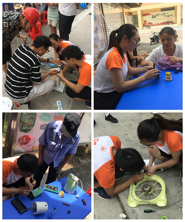 在休息片刻,义务维修就正式开始了。社区社区居民的热情超出我们想象,他们早早地就等在了社区居委会门前,将电风扇、收音机、电水壶、电饭煲、智能手表、电动足浴盆等需要维修的电器放在桌子上。团队成员也被这种热情感染,大家干劲十足,有序地投入到工作当中。办公室的志愿者开始组织居民排队登记;负责宣传的志愿者则开始拍照,在社区内分发宣传单;其他志愿者开始着手修理出现故障的电器。维修工作如火如荼地进行着。