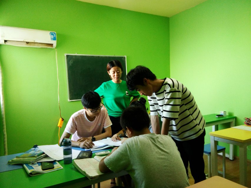 儒林教育机构位于两室一厅的普通居民房内,室内装饰很简单,装饰色调以黄绿色调为主,营造了一种清新放松的学习氛围。一进门,就能看到客厅里一张褐色的配备了很多凳子的大长桌,让人脑海里马上浮现了小饭桌辅导的情景。屋内的两个房间被用作了两个教室,教室虽然不大,但该有的教学设备一应俱全。调研团队8:30左右走进儒林教育机构的时候,已经有4个初中生正在教室自习,14个小学生已经在教室上课了。接待调研团队的鲁老师很热情,急忙招呼着调研团队的队员们坐下来。在谈话中了解到,鲁老师也是大学毕业没多久就来到儒林教育机构做老师。在调研队员给4个初中生发放调查问卷的时候,鲁老师笑着调侃填问卷比较慢的男生说:“问卷填得这么慢,就知道平时阅读理解也做得不快。”鲁老师旁边的三个初中生都不约而同地笑了。