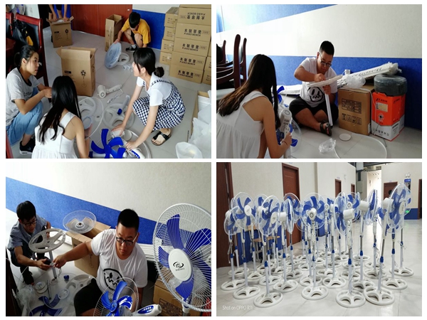 7月16日,暑期实践第一天,我们按时到达教室等待老师为我们分配工作任务,考虑到我们的专业特色,老师让我们将学校新进的一批电风扇组装好,我们听后都有点雀跃,因为在学校里面学习到的能力终于能够派上用场了。同时作为一个工科生,对于组装东西都有极大的兴趣。接受任务后,就是等待队长为我们分配了,两个人负责一箱,一箱里面有两个电风扇。仔细的研究了说明书、弄懂组装原理之后,我们就开始了组装任务。大家互相帮助,一起克服难题,组装速度也慢慢加快了。大约三个小时之后,五十个风扇组装完毕,组装完毕的风扇随即投入使用,绝大部分都能够运行正常,并且对于少数运行有误的风扇进行了修缮。学校老师对我们的工作成果十分满意,并对我们的能力表示认可,第一项任务圆满完成。