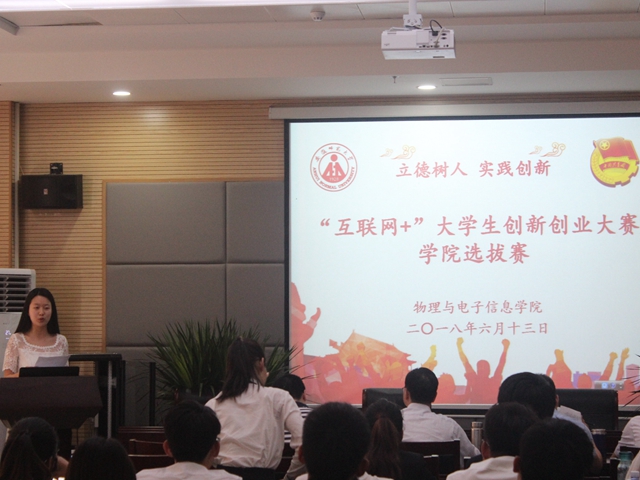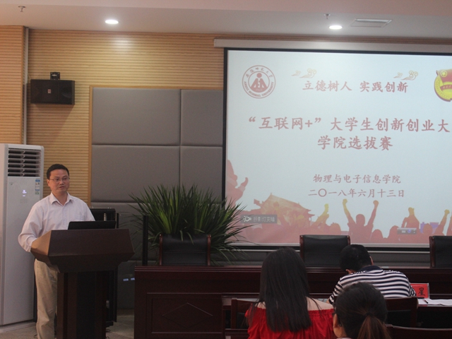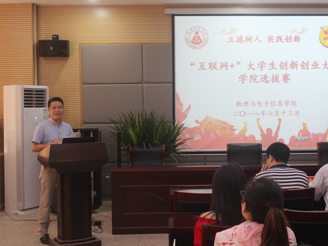 在理化大楼学院335报告厅举办“互联网+”创新创业大赛学院选拔赛,丁绪星教授、方明星教授、刘小明教授、学院党委副书记吴长义、团委负责人宋凤楼担任本次大赛评委。