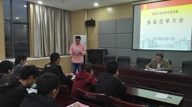 通信工程本科生党支部大会在理化大楼三楼会议室顺利召开。会议由上届支部书记米佳佳主持,院党委副书记吴长义、校组织部廖仲明老师出席会议。