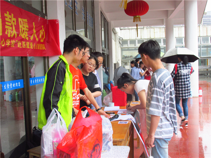“千方爱心学校”赴西藏爱心支教团队于2017年6月6日、8日在食堂前广场举办了“人间自有真情在,爱心捐款暖人心”爱心募捐活动。活动旨在为西藏贫困儿童募集学习用品、生活玩具,募集善款。院党委副书记吴长义,院团委书记米佳佳,辅导员秦瑾琼,张杰出席本次活动。
