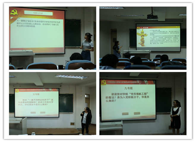 现场答辩环节中,问题包括“两学一做”,“一带一路”的丝绸精神,“党员领航工程”等,答辩者们围绕入党动机、时事热点、政治觉悟等内容,并结合自身学习、实践生活等对问题作出了精彩回答。答辩时陶老师提到,“战争年代,扛炸药包是党员的特权;在二十一世纪,党员的特权是对人民的责任和义务”,答辩会全体成员鼓掌赞同。答辩会进行了两个多小时,答辩者均表明了自己的入党动机以及强烈想要加入中国共产党的心声。