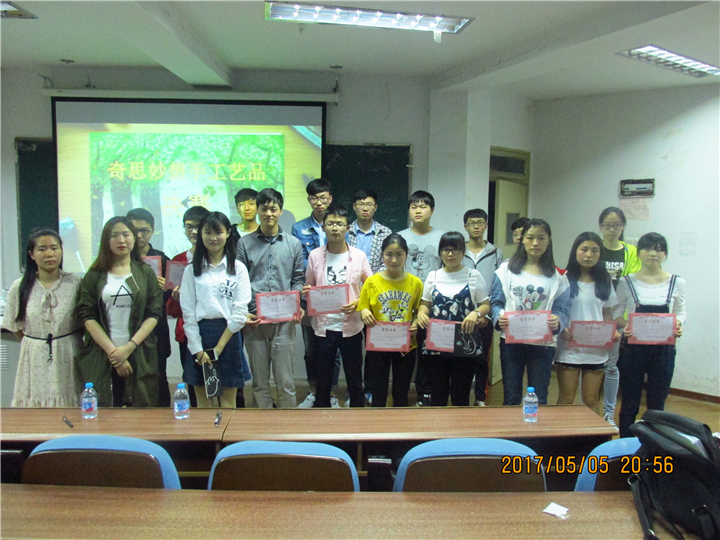 本次活动共分为PPT汇报和评委提问两个环节。参赛选手们在比赛中发挥实力,各显其能。三号四号选手以节约环保为理念,利用平时定外卖时所剩下的勺子筷子,制作出了外观美丽,新颖独特的勺子台灯和收纳箱。而二号选手则用平时用完的草稿纸反复加工利用,完成了一个实用美观的笔筒。而九号选手则已细腻的眼光观察生活,他发现老师上课时容易找不到粉笔的问题,于是用一个废弃的鞋盒制作了一个多功能的粉笔盒,能够分类收纳粉笔,解决了老师上课时的困扰。十四号选手充分利用了本专业的优势,运用一定的物理知识,通过手工制作,完成了一个3D全息投影仪,令人啧啧称赞。最后由完荣等人制作的3D全息投影和王新田等人的勺子台灯获得一等奖,活动后,获奖人员与工作人员拍照留念,比赛就此结束。