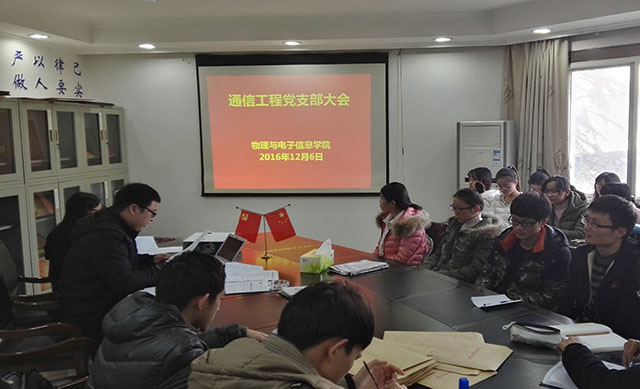 本科生通信工程党支部会议在行政楼三楼会议室顺利召开,主要讨论接收汪雪婷等十一名同学发展为预备党员。会议由支部书记米佳佳主持,14级通信工程辅导员汪光麒出席会议。