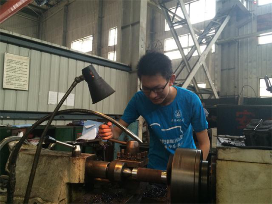 随后,队员们跟随昨天的师傅进入工厂,来到要进行实践操作的区域。师傅再次和队员们强调操作安全和注意事项后,开始讲解和演示基本操作步骤和操作要领,期间不时有队员向师傅询问具体的操作细节,师傅耐心细致地进行讲解,队员们由衷的敬佩这位师傅熟练的操作技能和丰富的操作经验。在师傅讲解和演示完后,队员们进入操作台,开始自己动手操作,进行零件加工的一些基本操作,一旁的师傅也在不时的进行指导,就这样每一位队员在师傅的指导下,完成了加工零件的操作。
