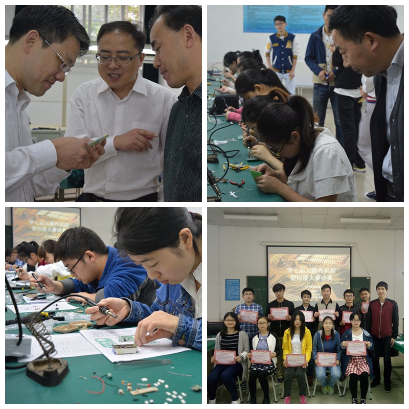 党委书记李娟、学院党委副书记吴长义和学院教学院长崔光磊也来到了赛场观摩指导。经过激烈的角逐,24名同学顺利晋级决赛。决赛要求参赛选手在规定时间内完成FM微型贴片机的焊接。在比赛过程中,选手注意力高度集中,认真识别元器件并依照装配图进行耐心焊接,并不断进行调试。最后评委老师对焊接时间、焊接精细程度及调试效果三个方面进行打分。经过角逐,管诺、操焰、刘阳四位同学获得一等奖,其他选手分别获得二等奖、三等奖和优秀奖。比赛期间,学院专业老师蔺玉柱、邹文兵、高伟以及王家驷四位老师全程参与指导。