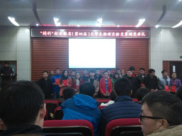 本次竞赛由安徽省物理学会主办,黄山学院承办,旨在激发大学生学习大学物理实验的积极性,培养学生创新思维与创新能力,提高学生运用大学物理实验知识解决实际问题的能力。来自合肥工业大学、安徽大学、安徽工业大学等24所本科院校共96名选手参加了竞赛。比赛分为光学和电学两场,从实验设计、实验操作、数据处理和误差分析等方面对学生进行实验技能的全面考核。由崔光磊、冯霞两位老师指导的2013级物理学专业张良、蔡亚芬以优异的成绩荣获一等奖,崔婷婷、高超荣获二等奖。
