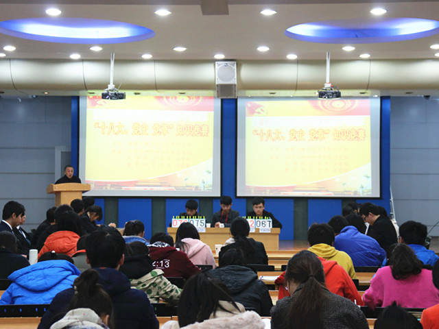 分党校主办,化材学院、教科学院、生科学院分党校协办的“十八大、党史、党章”知识竞赛在赭山校区报告厅隆重举行。学院关工委陶绪德老师、党校班主任汪光麒、化材学院辅导员费白露、教科院分党校班主任马兴以及四个学院分党校学员共同参加了本次活动。