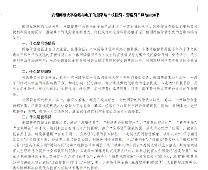“校园贷、套路贷”风险告知书》,普及金融信贷和网络安全知识。各班级积极组织召开主题班会,宣传不良网络借贷相关法律法规,强化学生理解和认识。主题班会形式多样、内容丰富,通过播放专题警示片加深同学们对其危害的印象,通过案例分析和研讨帮助同学们认识不良校园贷产生的原因,通过主题发言引导学生树立正确的消费意识,提升网络安全防范意识。