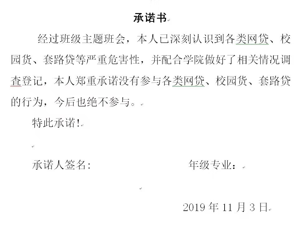 在全面了解不良校园网贷产生和发展的原因及其所带来的严重危害之后,各班级同学积极参与“远离校园贷”宣誓活动并集体签署了拒绝校园贷承诺书,积极响应号召,提升自身安全意识,营造一种积极向上、勤俭节约的良好文化氛围。