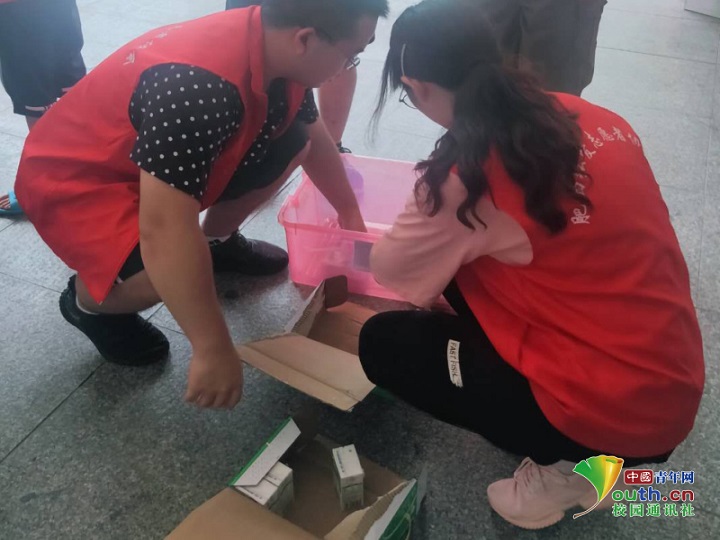 图为徐姚在合肥市肥西区肥西三中灾区临时安置点分发牛奶。