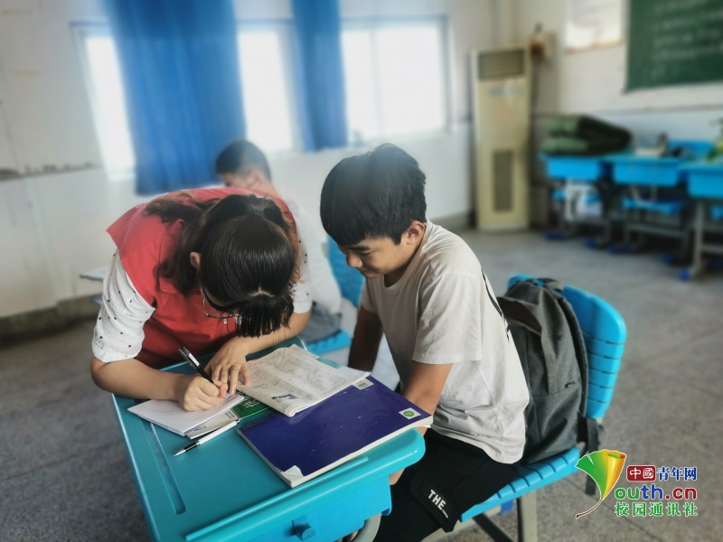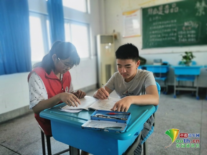图为徐姚在合肥市肥西区肥西三中灾区临时安置点辅导学生功课。