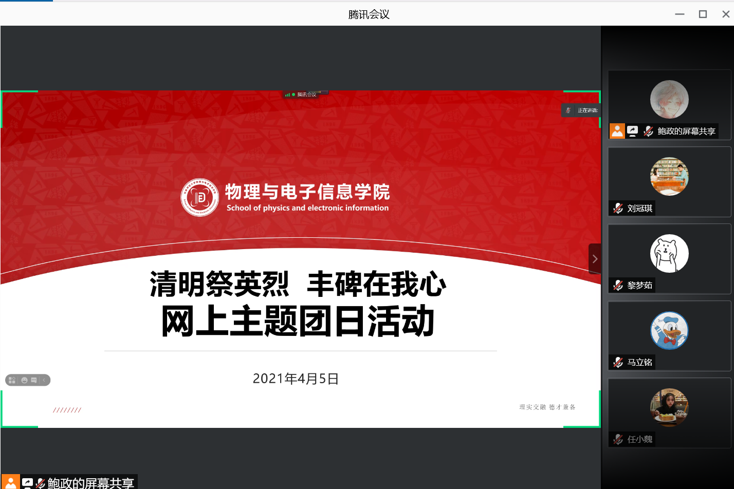 辅导员刘冠琪、团委委员及部长、2020级物理拔尖班全体团员参会。刘冠琪做《立心·力行 做新时代的青春逐梦人》党史青传微宣讲,切实讲好党的故事,革命的故事,英雄的故事。 宣讲结束后,播放短片《铭记!用生命守护生命的勇士》,团员代表任小魏、吴倩倩、邢广基结合宣讲内容和短片,分享最打动自己的烈士故事。