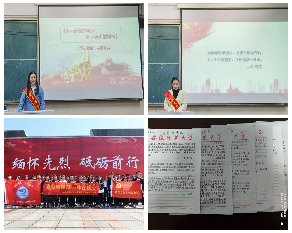 学院通过学生党支部书记上专题党课、团支部主题团日活动、党史故事分享会等方式深入学习习近平总书记在党史学习教育动员大会上的重要讲话精神;“党史青传”微宣讲深入班级、深入活动现场开展系列宣讲,用“青言青语”宣传党史党情;院团委积极组织开展“清明祭英烈”系列主题活动、“我想对党说”心语征集活动,在一场场实践活动中实现让党史学习教育走深走实。