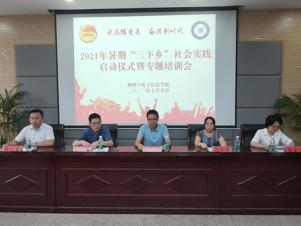 在物理楼304会议室举行2021年暑期“三下乡”社会实践启动仪式暨专题培训会。校团委书记汪凯,社会实践思政指导老师高艳杰,学院院长郑贤锋、院党委副书记黄友生,副院长张爱清,指导教师代表吕建平、冯友宏、曲立国、周正仙、蔺玉柱、甘露,全体专兼职辅导员,社会实践团队代表参加了启动仪式。会议由学院团委书记刘冠琪主持。