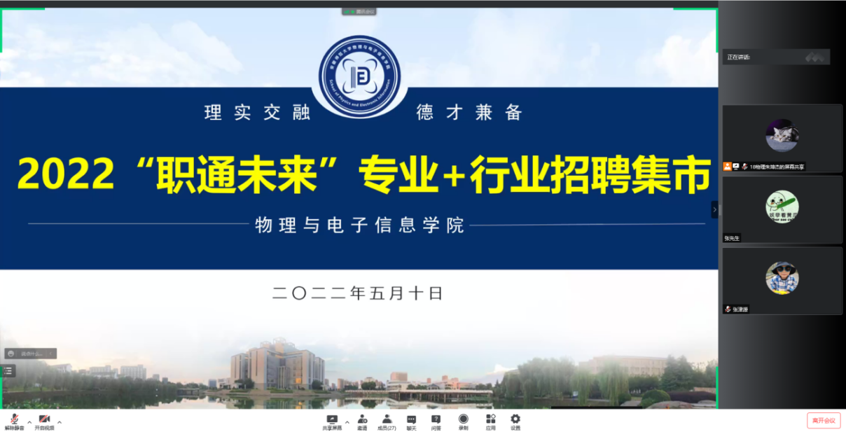 举办第五期2022“职通未来”专业+行业招聘集市。当天参加的招聘单位主要是面向学院专业毕业生招聘的埃科光电、合肥君正、长鑫存储、广州杰赛、中国电子5家企业。学院各专业毕业班待就业学生线上参加,此次会议由学院辅导员张津源主持。