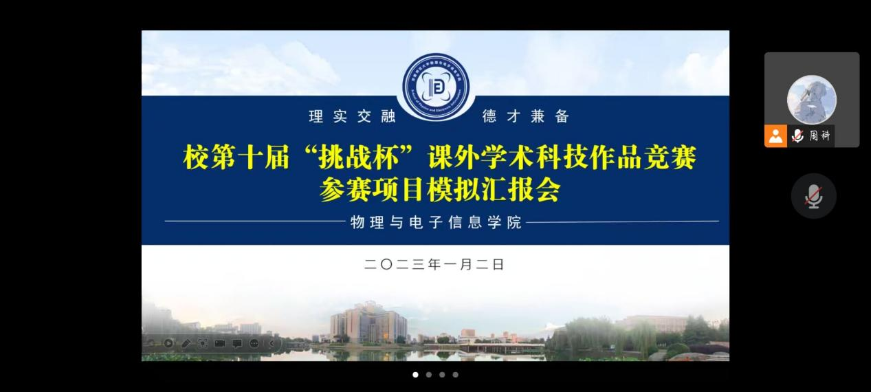 校第十届“挑战杯”课外学术科技作品竞赛参赛项目模拟汇报会通过线上会议形式顺利举行。学院党委副书记黄友生、副院长张爱清、物理学专业负责人吕建平、通信工程专业负责人冯友宏、自动化专业负责人郑睿、工科实训中心主任蔺玉柱、专业教师王长江、甘露老师参与本次会议的线上指导,各入围校级决赛选手参加线上模拟汇报,会议由学院团委书记刘冠琪老师主持。